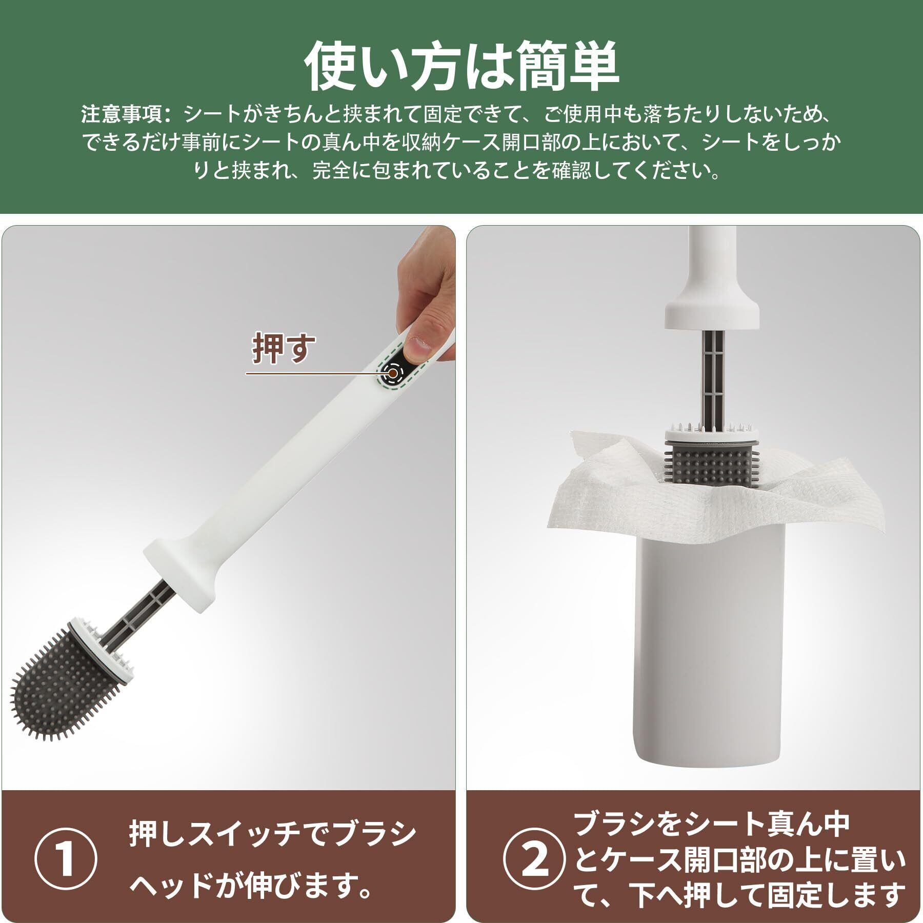【使い捨てシート30枚付き・手を汚さず衛生的】: 使い捨てシート30枚が付属します。ワンタッチで装着・取り外しができるので、掃除中から捨てるときまで、汚れたブラシに直接触れる必要がありません。掃除が終わればワンタッチでそのままゴミ箱へ捨てればいいです。毎回使い捨てなので、菌の繁殖やニオイを抑え、トイレを常に清潔に保ちます。
