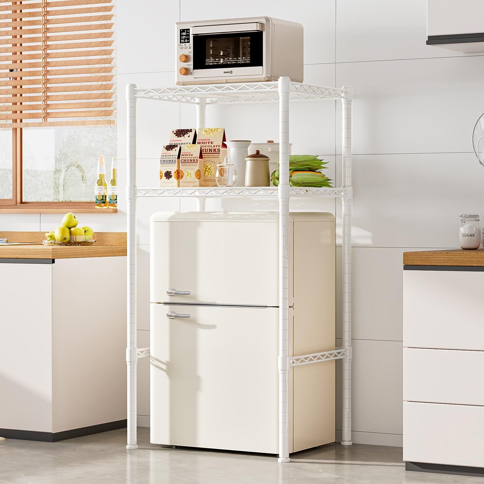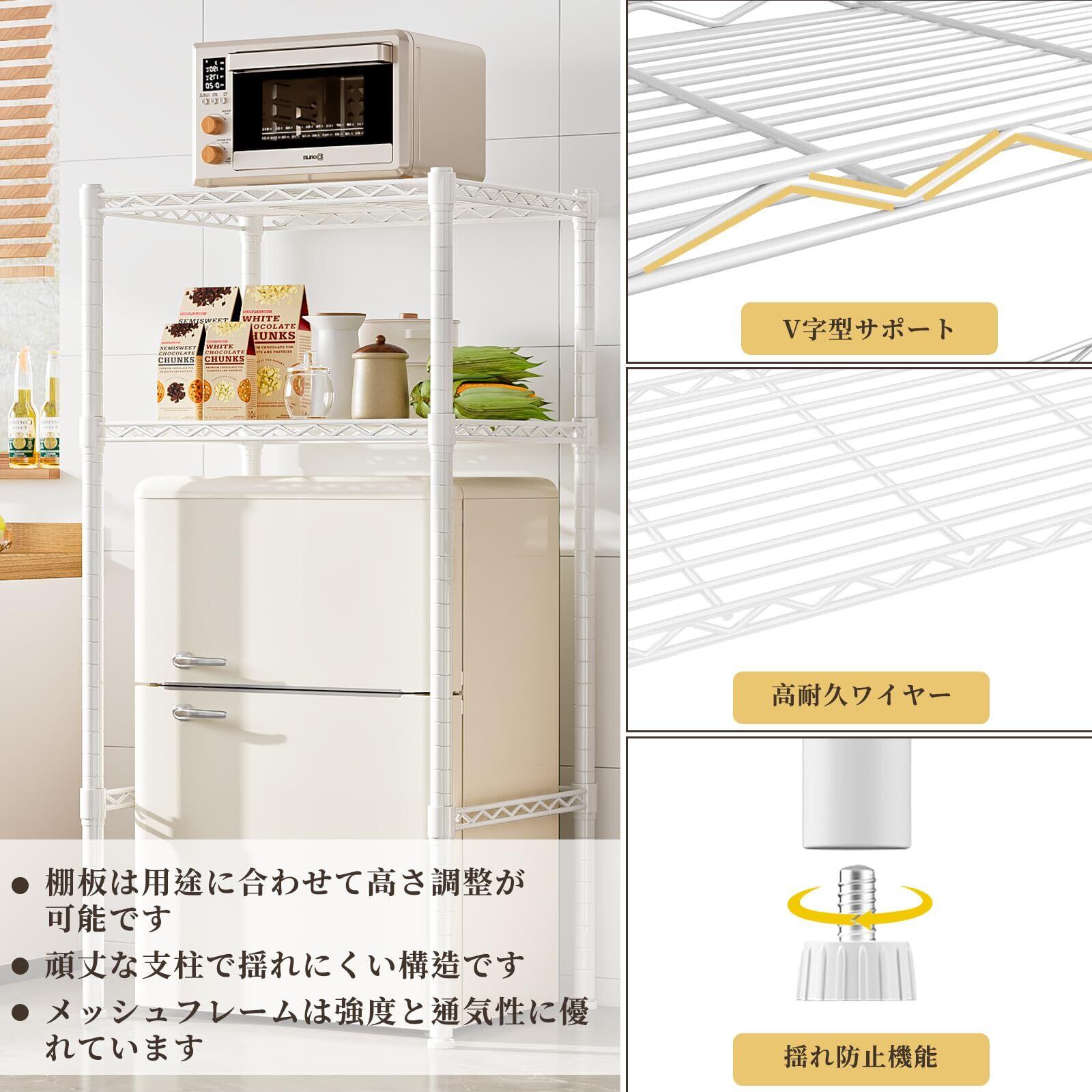 【スペースを最大限に活用】無段階で高さ調整が可能なため、ラックの下にゴミ箱、小型冷蔵庫、小型洗濯機などを置くことができ、狭いキッチンのスペースを有効活用できます。空間を無駄なく使えるキッチンラックです。