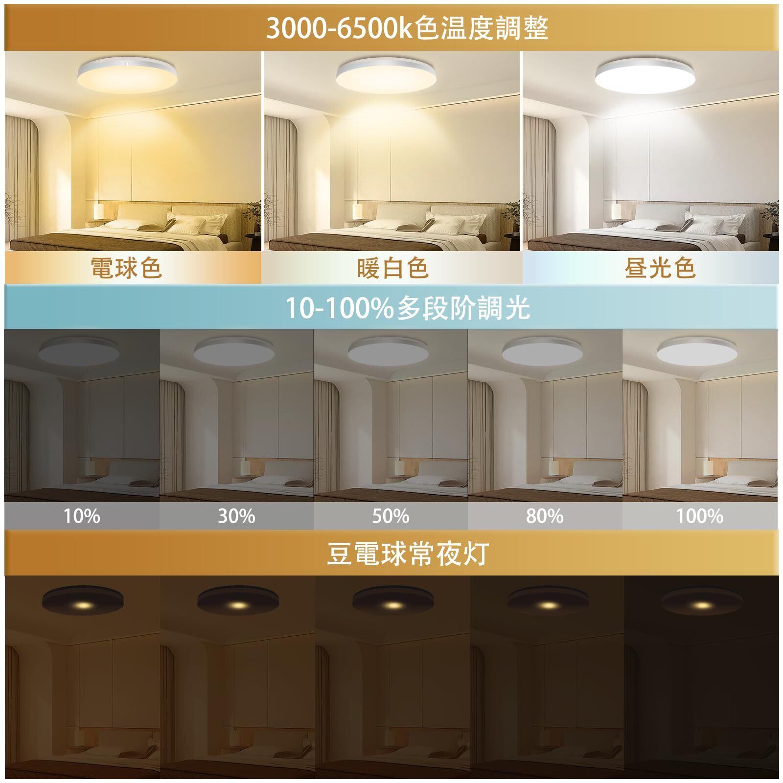 【無段階調光・調色】明るさは10〜100%まで、色温度は電球色から昼光色まで調整できます。シーンに応じて最適な明るさと色温度を自由に設定。リビングルーム・キッチン・寝室・玄関など、さまざまなシーンに適用します。3つの色温度(電球色、昼白色、昼光色)に切替可能、リモコンや壁スイッチによりワンタッチで3つの色温度への切替ができます。