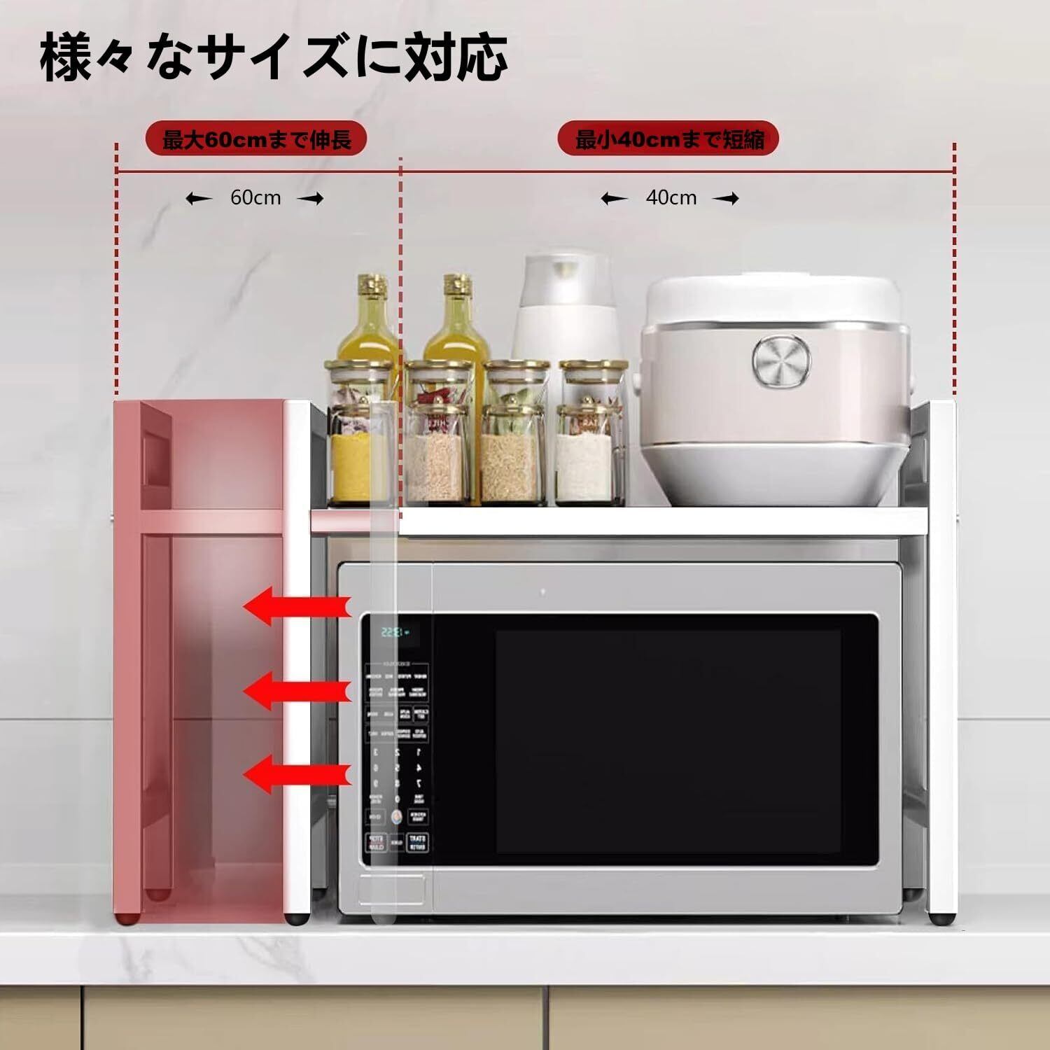 レンジ上ラック トースターラック レンジラック 伸縮式 幅40~60cm調節 棚板高さ調節可 キッチンラック レンジ台 レンジボード キッチン収納 調味料棚 頑丈 耐荷重50kg 組み立て簡単 省スペース フック6個付き 組み立て動画参考