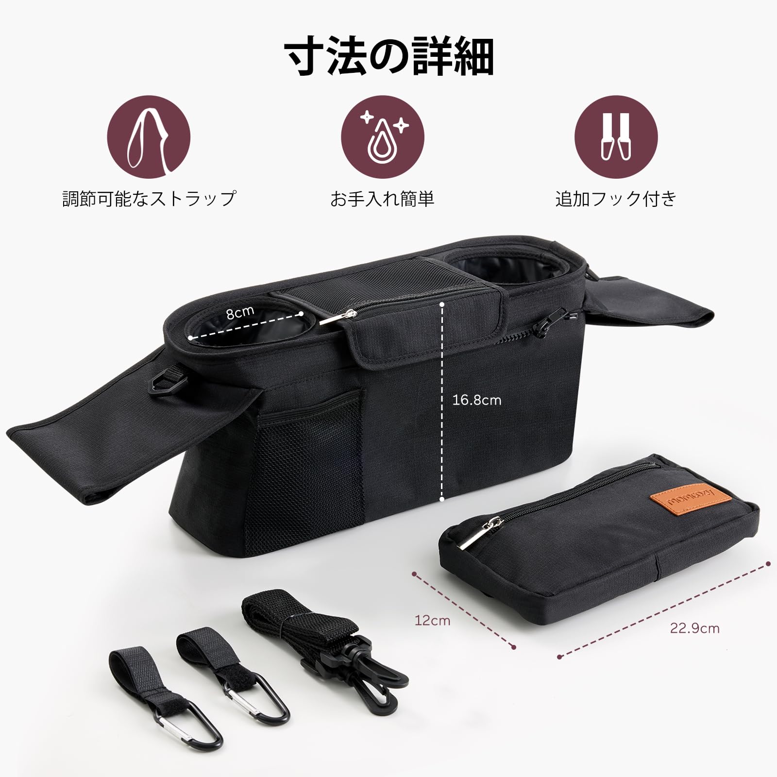 大容量収納:ベビーカー ドリンクホルダーで40 ozの大きなボトルを安定して収納でき、携帯電話や貴重品を整理するポケット付き。旅行や外出にも最適です