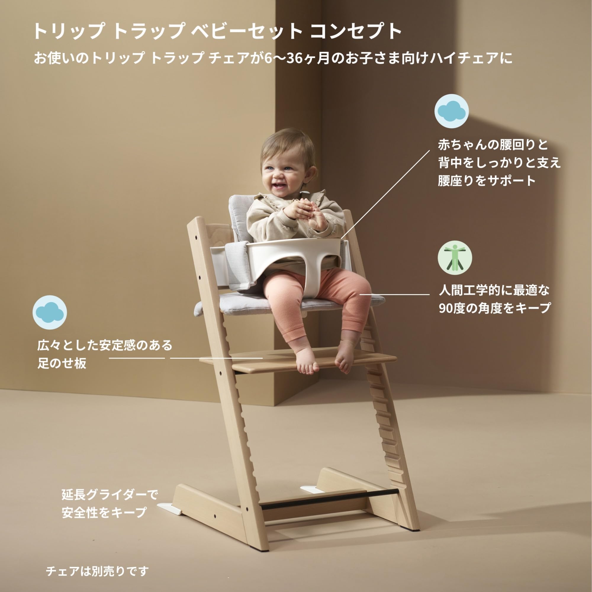 高い背もたれとガードで赤ちゃんをしっかりと支えます。後方への転倒を防ぐために、延長グライダーセットが付属しています。延長グライダーセットを必ず取り付けた状態でご使用ください。ベビーセットに対応するダイニングテーブルの高さは、72~76cmです。トリップ トラップの座面を、1段目に設定した状態でご使用ください。座面を2段目以降に設定すると、ベビーセットをトリップ トラップに取り付けできません。安全性を高めるために、立ち上がり防止のハーネス(別売)を合わせてお使いいただくことをおすすめします。 【特長】 お子さまが一人座りできるようになる頃 から、トリップ トラップに取り付けてお使いいただけます。 背もたれとガードで、お子さまの体をしっかりと支えます。 2003年5月以降に製造されたトリップ トラップに取付け可能です。(シリアルナンバーの一番始めの数字が3以上の数字で始まる製品) 旧型の木製ベビーセットは現行のトリップ トラップに取り付けできません。 【含まれるもの】 トリップ トラップ 延長グライダー 【メンテナンス】 湿らせた柔らかい清潔な布で汚れを拭き取り、すぐに乾いた布で空拭きしてください。湿り気が残っていると染みの原因になります。 洗浄剤の使用は推奨されません。 直射日光の当たる場所に放置すると、変色の原因となる場合があります。