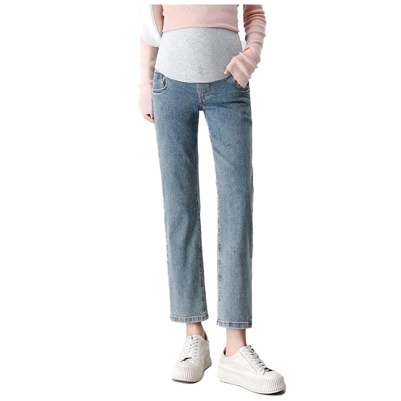 [Onabebi] マタニティパンツ ジーンズ ストレートパンツ 九文丈 妊娠服 薄手と裏起毛タイプ ウエスト調整 ポケット付き 体型カバー 足長効果 美感