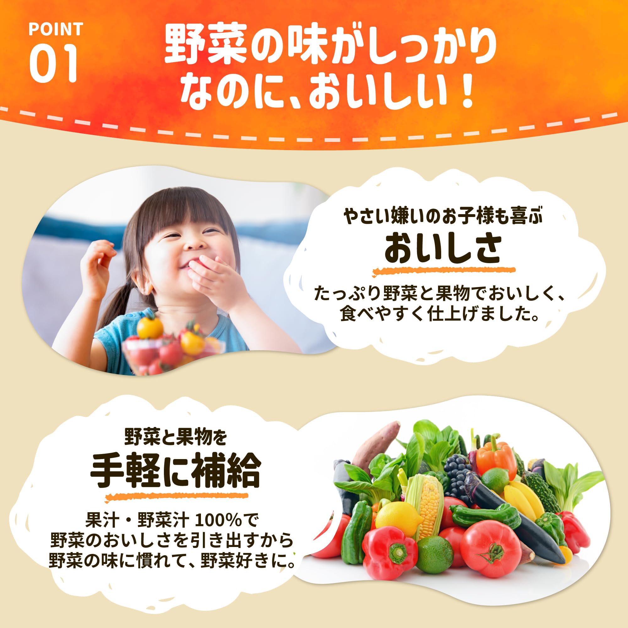 ●アソート内容 緑の野菜とくだもの(ピーマン・ほうれん草・キャベツ・パセリ・レタス・りんご・ぶどう・レモン)×24個 ※アレルゲン(27品目中):りんご 赤い野菜とくだもの(にんじん・トマト・有色甘藷・赤ピーマン・ラディッシュ・りんご・ぶどう・レモン)×4個 ※アレルゲン(27品目中):りんご 紫の野菜とくだもの(有色甘藷・トマト・にんじん・赤ピーマン・ラディッシュ・ぶどう・りんご・レモン)×2個 ※アレルゲン(27品目中):りんご ●8種類の野菜と果物でギュッとおいしく仕上げました! 果汁+野菜汁=100%! ●手に持って食べやすいストロー付きパウチ容器なので、お子さまの「自分で飲みたい! 」を応援します。 ●誤飲防止に配慮した大きなキャップを採用しました。 ●着色料・香料・保存料・人工甘味料不使用! 素材を生かした自然な味わいに仕上げました。おやつにもピッタリ! ●冷やしても、凍らせてもおいしい! お出かけ先や、車の中でも、こぼさずお飲みいただけます! ●対象年齢:1歳頃からずっと ※販売用の専用箱入り商品です