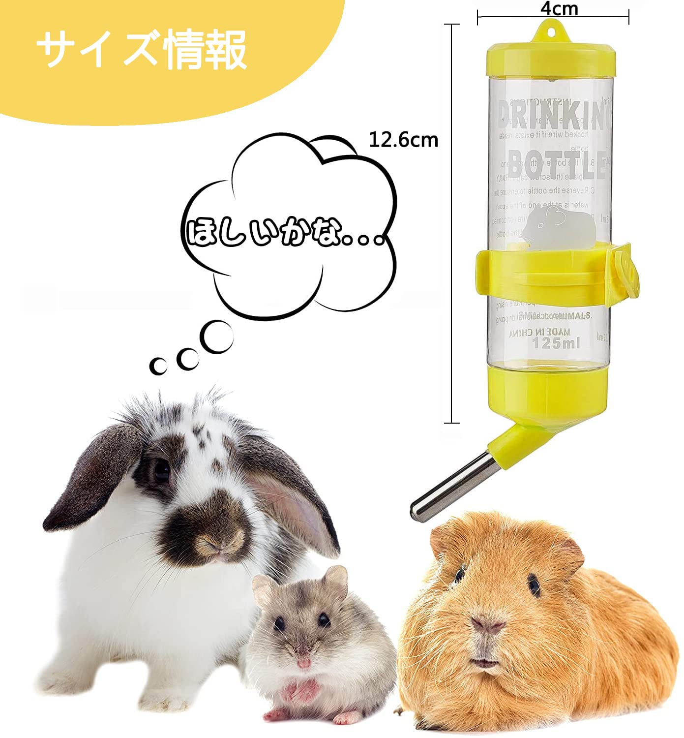 【使い方】まず必ずボトルに水をいっぱい入れて、指で水口を塞ぎ、気泡が出て滴が出るまで数回上下に瓶の体を振り、瓶の内外の圧力の平衡をさせます。最後にケージに取り付けるだけでいいです。