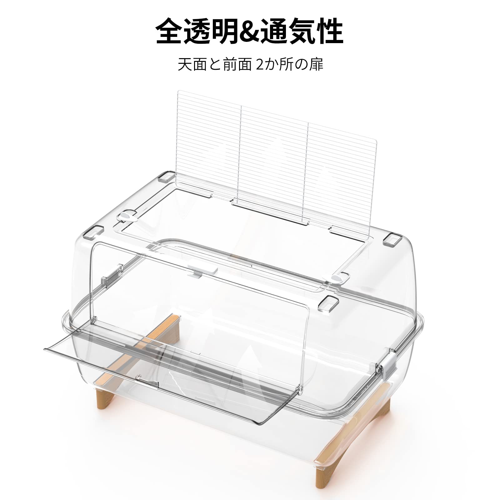 【2か所の扉&お世話やすい】天面と前面の2か所に扉がついているので、お世話の目的に合わせて使い分けられます。掃除のときはルーフを大きく開き、ちょっとしたお世話のときは小窓を開くなど、シーンによってケージの開け方を選べます。大きな天面扉金網のデザインで風通しが良い、夏は快適に過ごすことができ、湿気がこもりません。