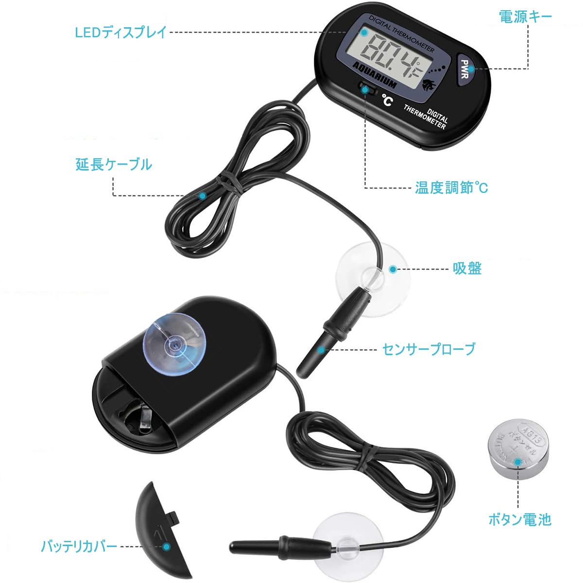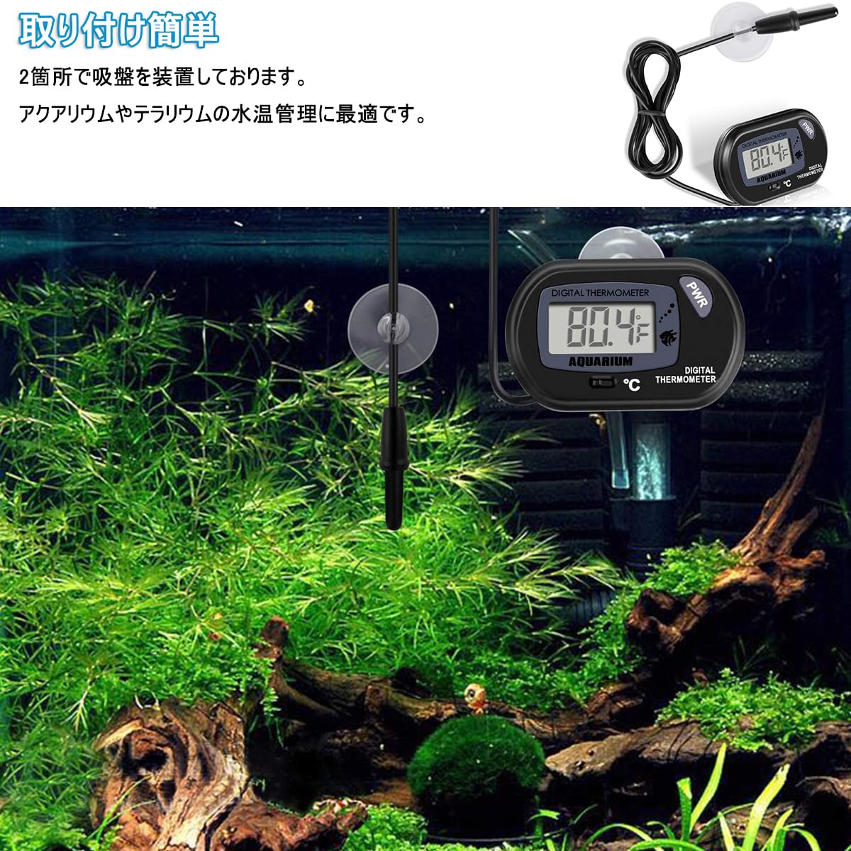 【インストールが簡単】リード線の先に温度センサーが付いており、本体はプロの液晶ディスプレイ。水槽壁面に取り付けても、水槽台に置いてもご使用できます。(水中プローブのみ、水温計を水中に沈めないでください)。