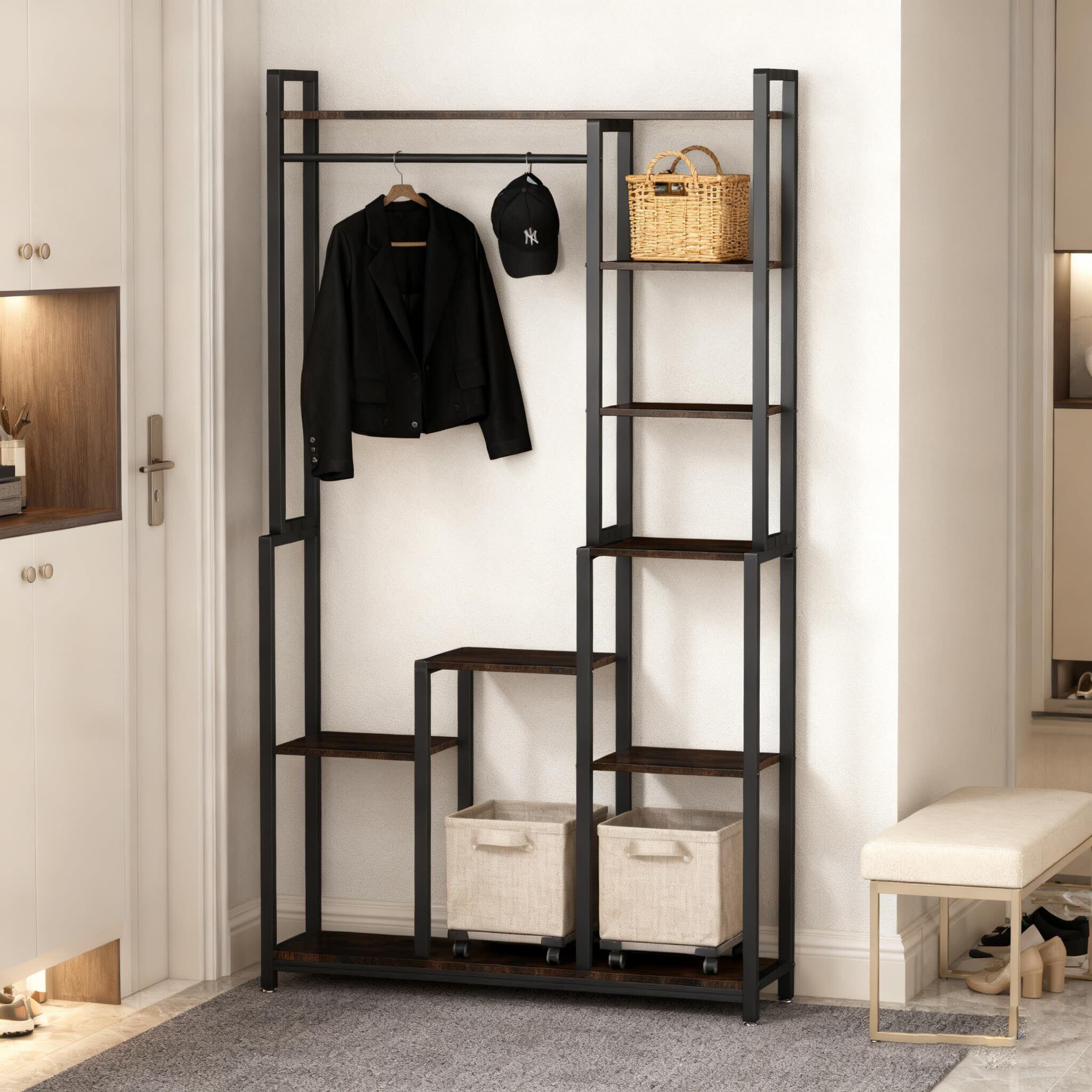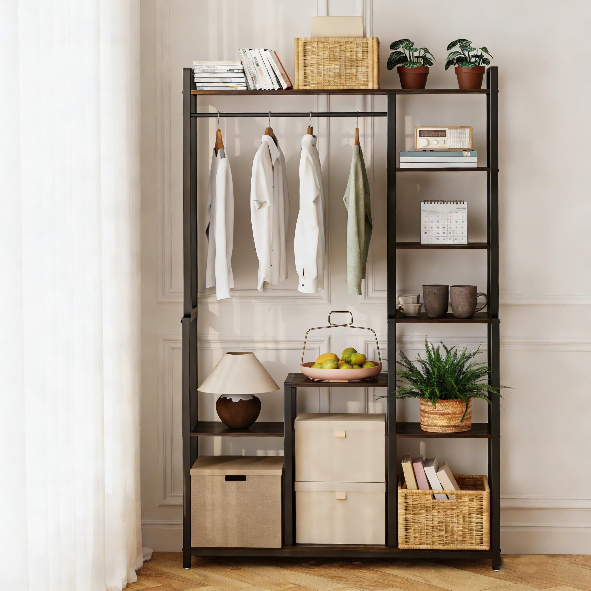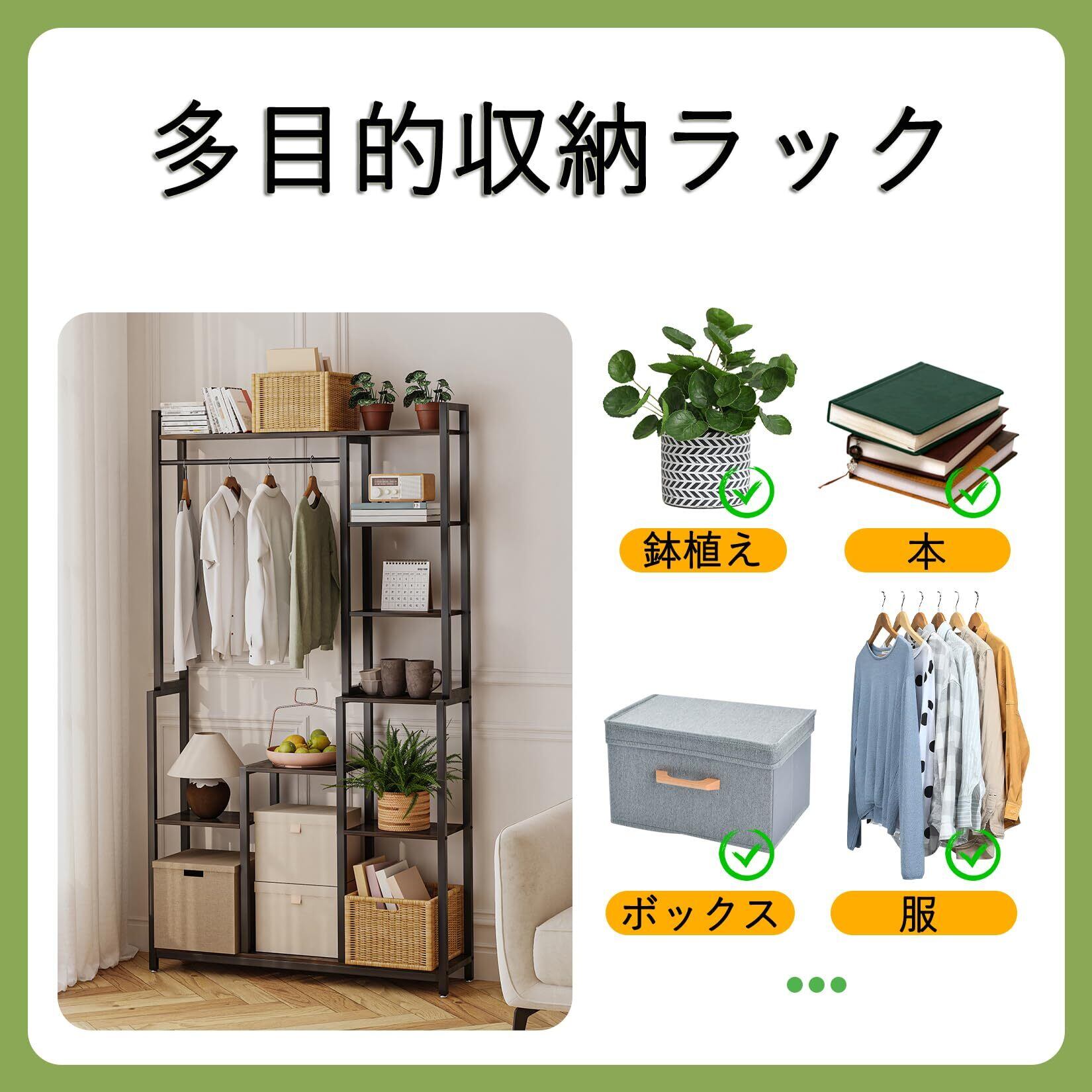 在庫一層!【多目的収納ラック】オープンラックとしてリビングや、キッチンの収納など用途は多種多様です。幅98cmのワイドタイプで、5段の棚板もハンガーパイプも付いているので、服、本、ボックスや観葉植物などたっぷり収納できます。また、異なる棚の高さは好きなものを好きなだけ収納できる自由度の高いデザインです