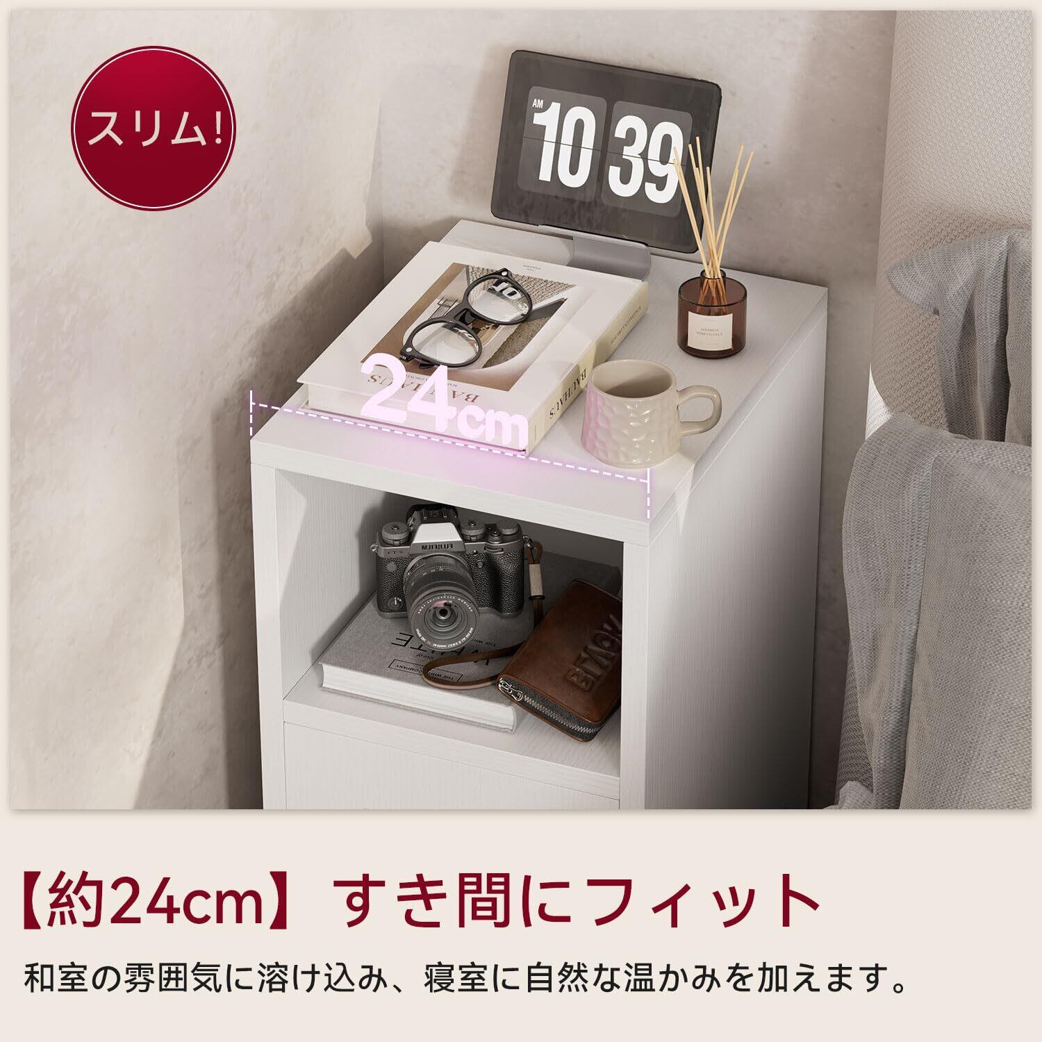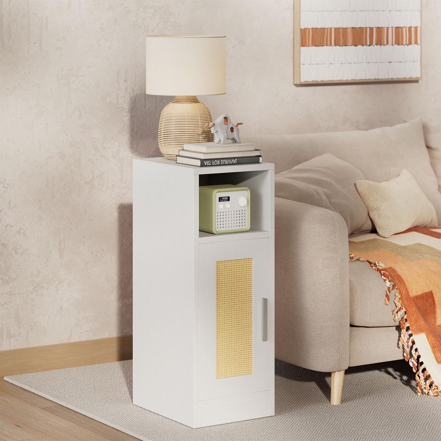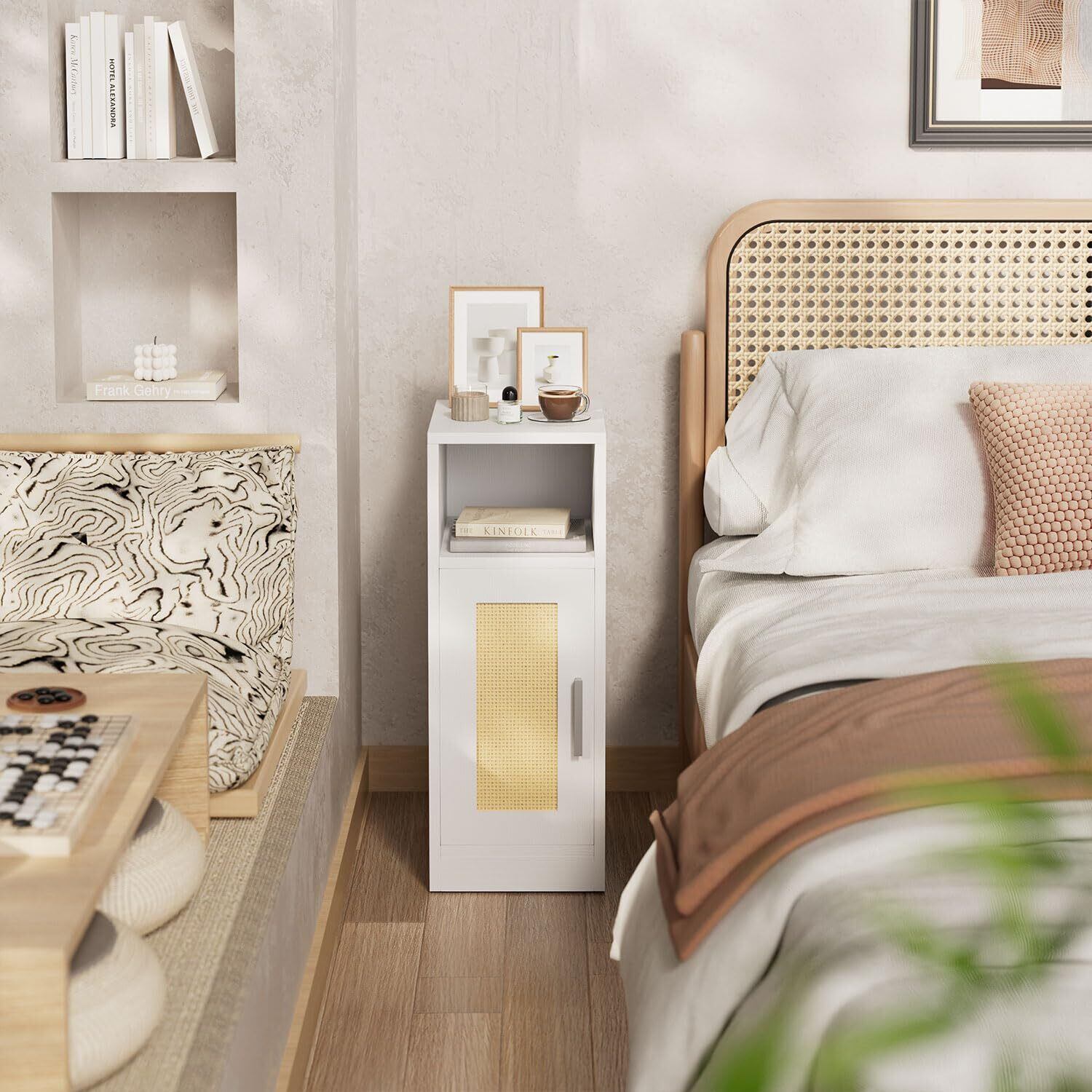 IBUYKE ベッドサイドテーブル ナイトテーブル ベッド横 テーブル 籐編み MDFボード 収納 扉付き すき間収納 スリム 木製 組立簡単 一人暮らし 和風 省スペース リビングルーム ベッドルーム用 ホワイト JPWNS012W