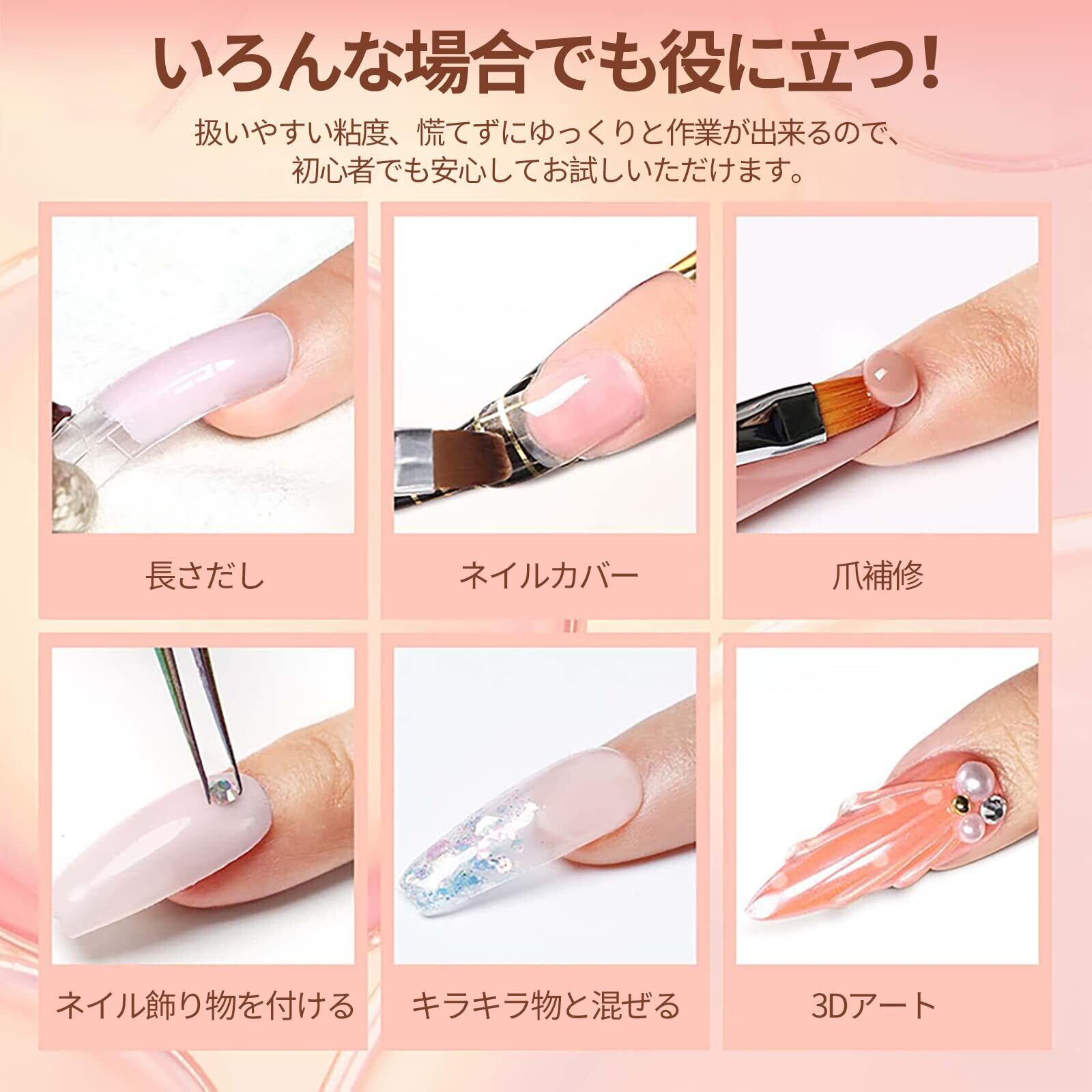 セット内容:このポリジェルセットには、15 g * 2本の長いだしジェル、スリップソリューション、ベースとトップコート、ネイルツールが含まれており、ネイルサロンや自宅のDIYに最適です