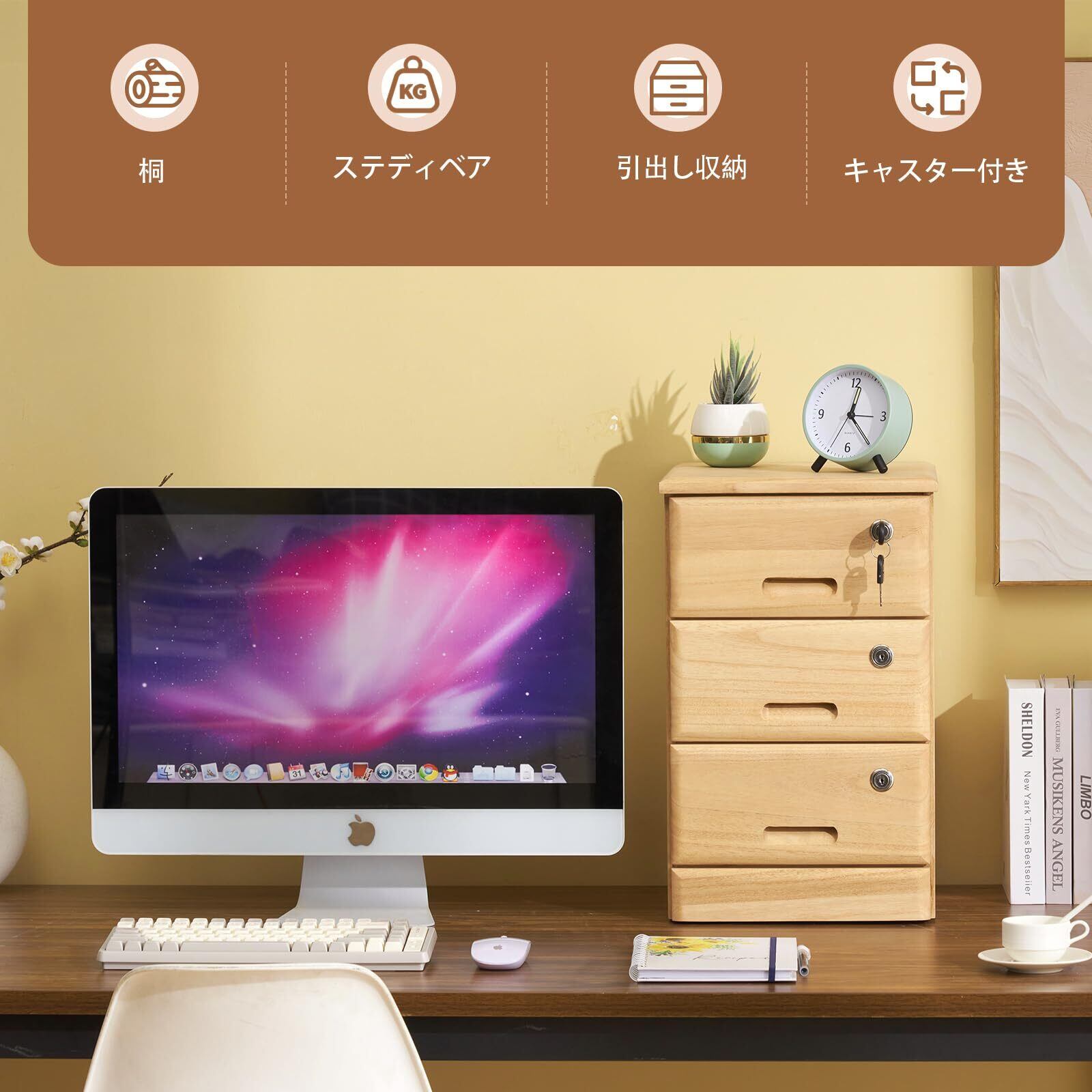 特徴3:【天然木桐製、軽量、美しい見た目】天然木桐製でおしゃれなキャビネットです。シンプルなデザインと落ち着いた色合いで、単体での使用も違和感なくインテリアに馴染む;オフィス、ベッドルームやリビングなど、様々な場所で使用できる。