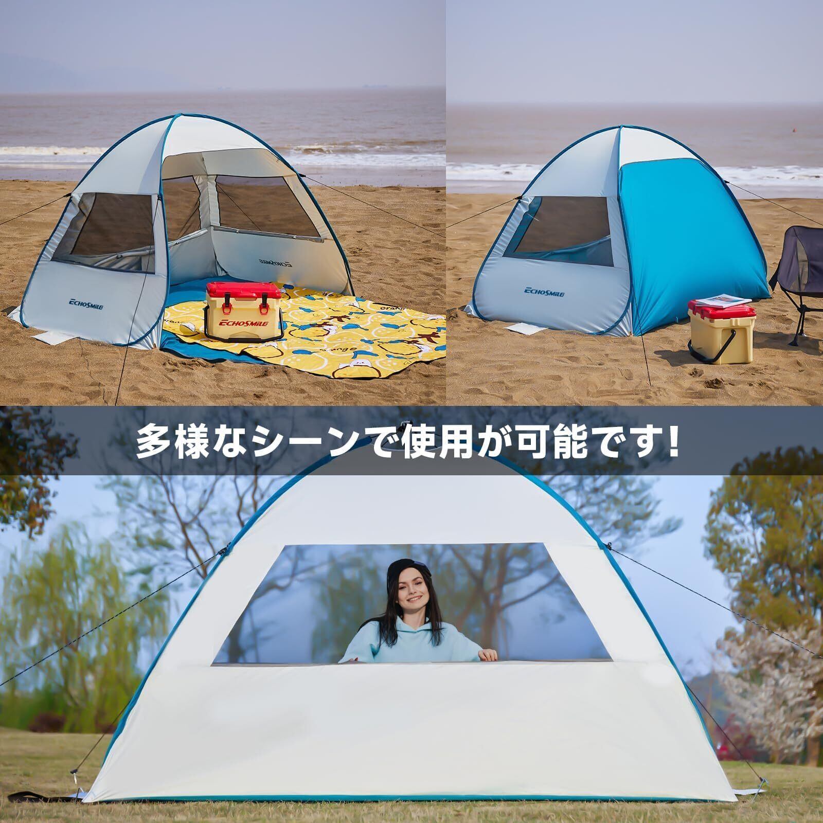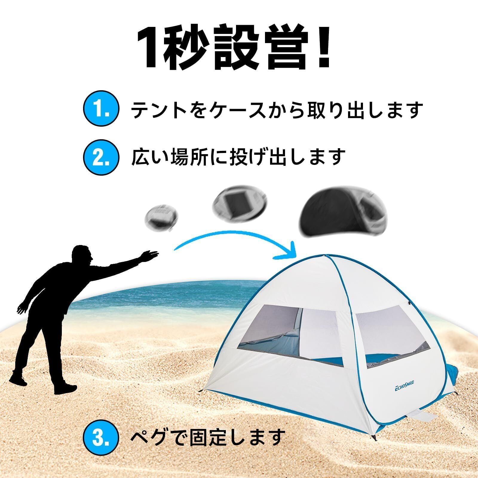 EchoSmile テント ワンタッチ 1秒設営 ポップアップテント ビーチ サンシェード 2人用 テント 軽量設計 防虫ネット付きフルクローズ 防水 耐水圧2500mm UV99% 簡単組立 アウトドア キャンプ ファミリー