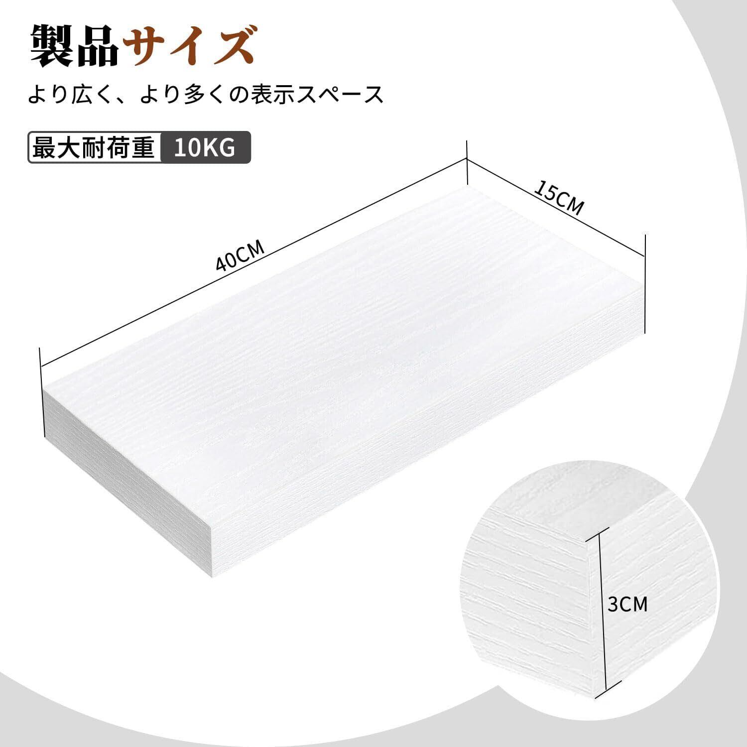 ウォールシェルフ 壁掛け棚 木製 取り付け簡単 インテリア ウォールラック 壁棚 壁面収納 キッチン 洗面所 リビング 寝室 玄関 (ホワイト(1個セット),板厚3cm (幅40cm x 奥行15cm))