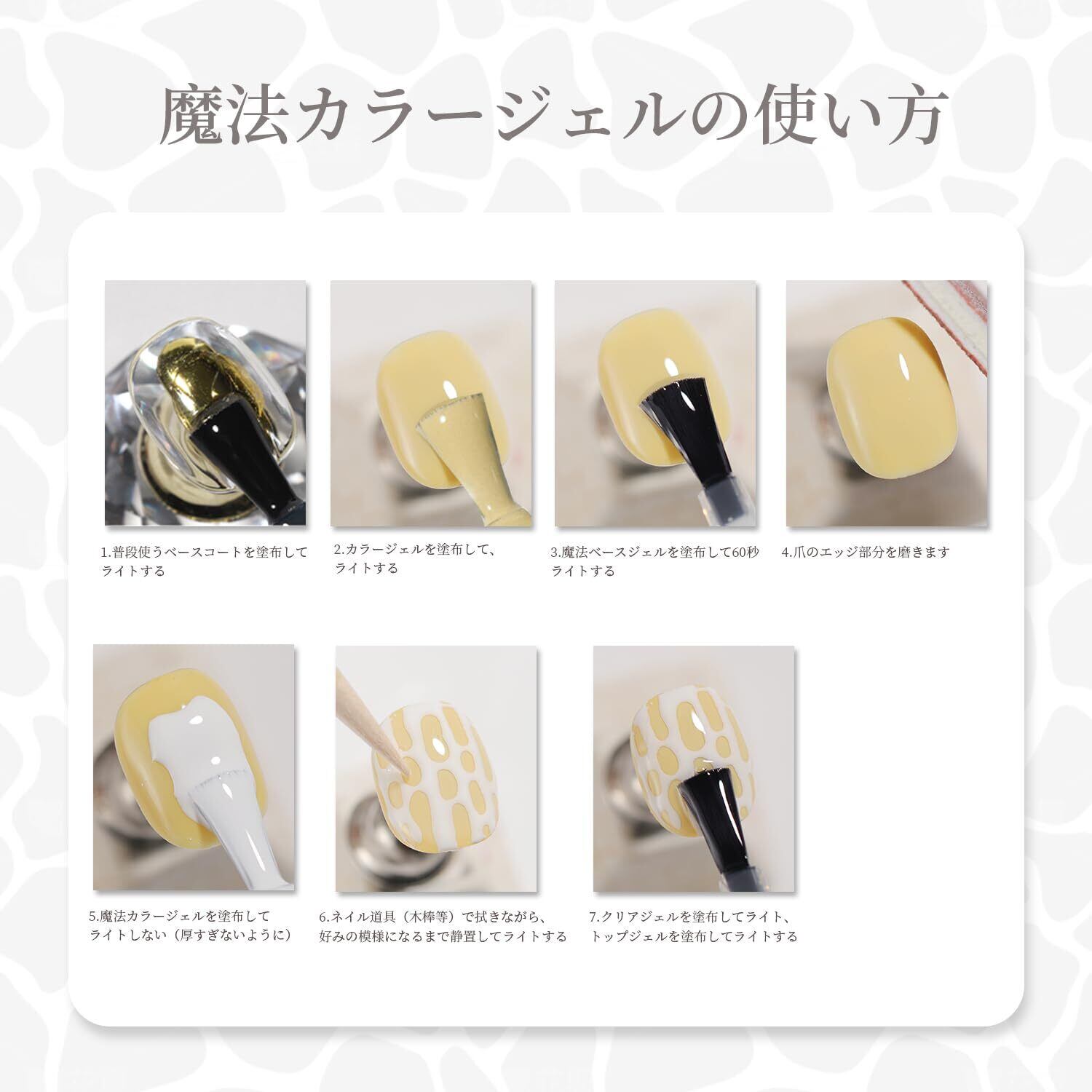 【専用魔法ベースジェルと併用する必要】アートの模様変化を実現するために、魔法カラージェルを使用する前に、必ず魔法ベースジェルを塗布することは必要です。普段のベースコートでは代用できないので、まずは、普段のベースコートを使ってね。