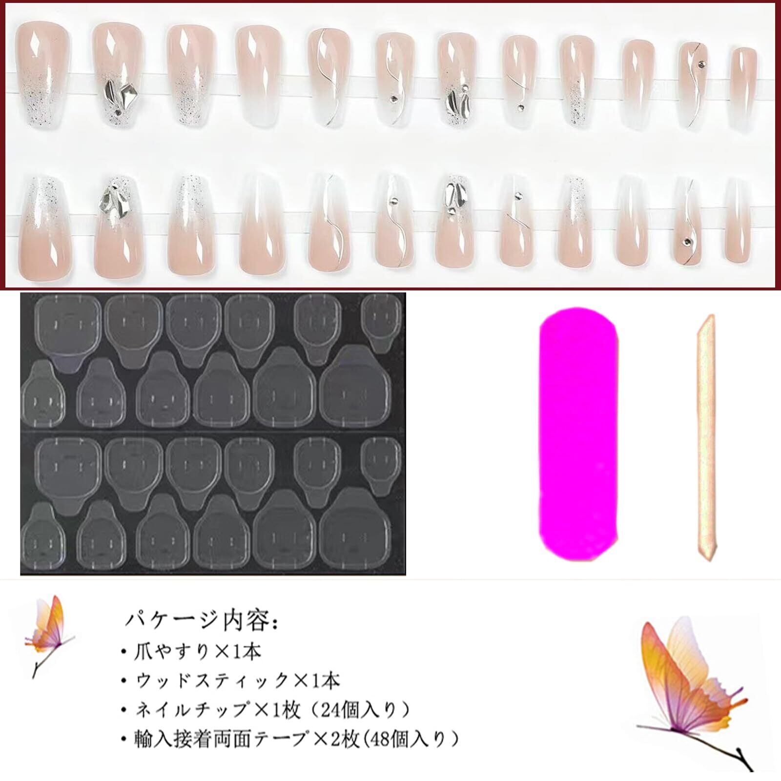 【届いたらすぐに使用できる】ネイルチップ(24枚・12別サイズ)/両面テープ2枚(48個)/爪やすり1本/木の棒1本など含んで、届いたらすぐに使用ができて、5-10分ぐらいはやく完成します。ネイルサロンに行くことが必要なく、お自宅で気軽的に綺麗なネイルが出来て、初心者でもお簡単に完成られます。