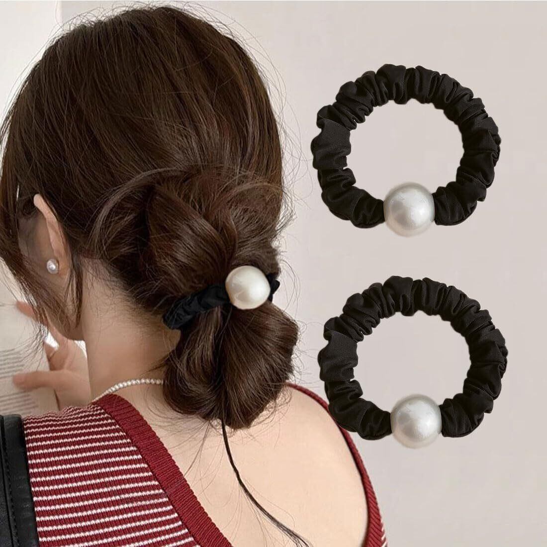 ヘアゴム パール 2個セット おしゃれ 髪ゴム ヘアアクセサリー ヘアゴム 黒大人 シンプル 髪留め 可愛い 跡がつかない 高弾性 韓国風 (黑+黑)