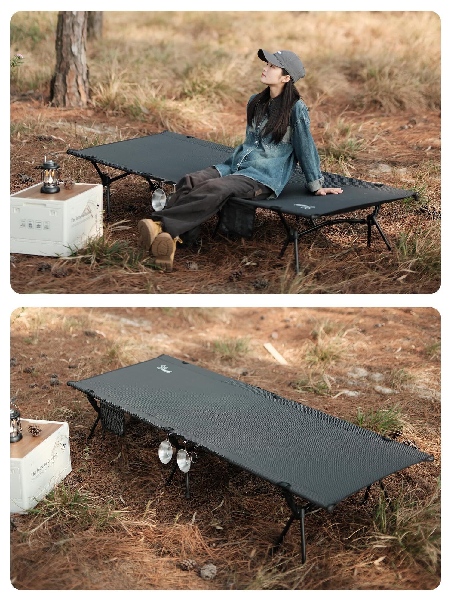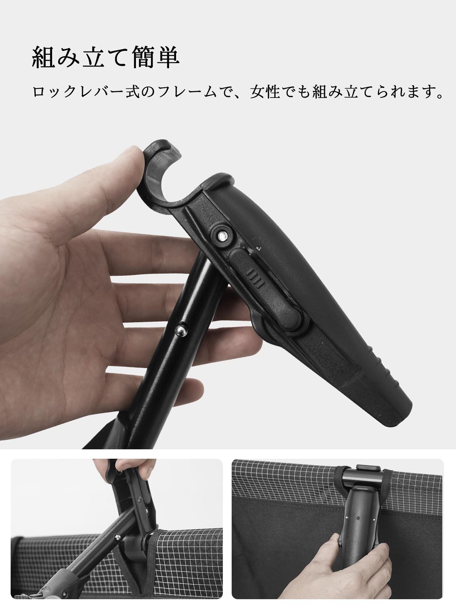 ❹機能性最高:サイドポケットは財布やスマートフォンを入れて一時的に保管ができるため何かと便利です。また、サイドポケットを使うことで、コットに腰掛ける際にカギなどを草むらに落として紛失するという事態を避けられます。