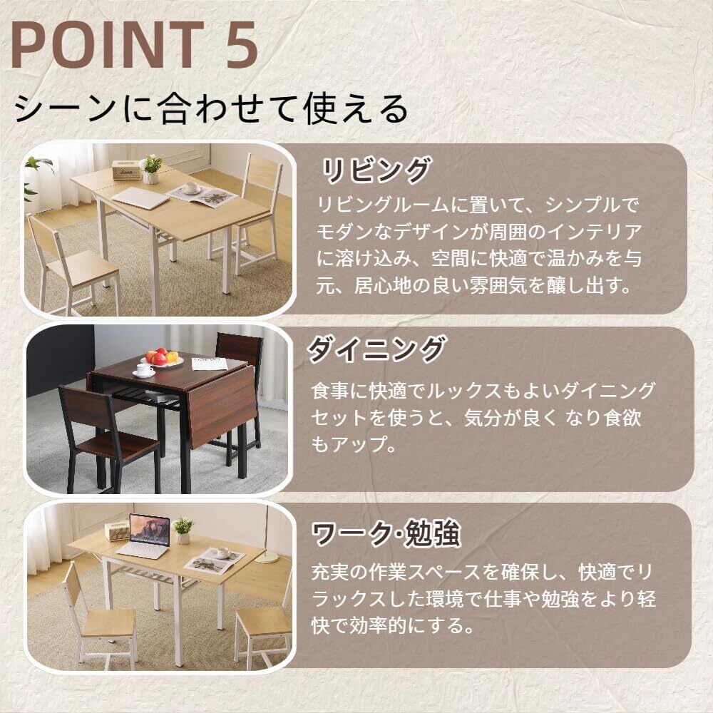 温かく心地よいダイニングスペースをお届けする。 折りたたみ式でスペースを節約し、来客時にも便利。テーブルの雰囲気に合わせて、3脚の椅子がセットになっており、どんなインテリアにも自然に溶け込む。