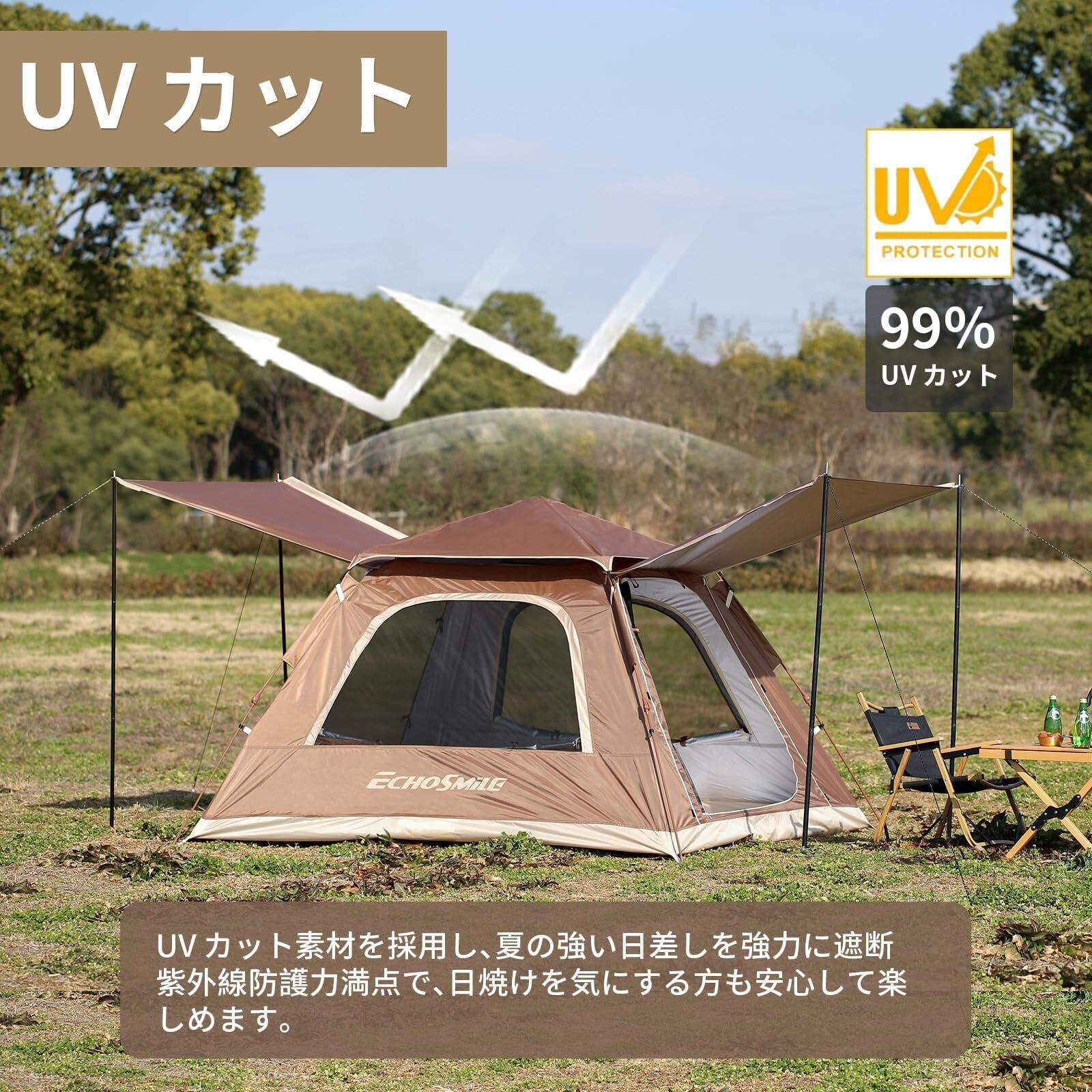 EchoSmile ワンタッチテント ポップアップ 3人 4人用 簡単組立 収納簡単 3000mm 耐水圧 UVカット 99% 防蚊ネット付き キャンプ 家族用テント 防災 軽量設計 ファミリー