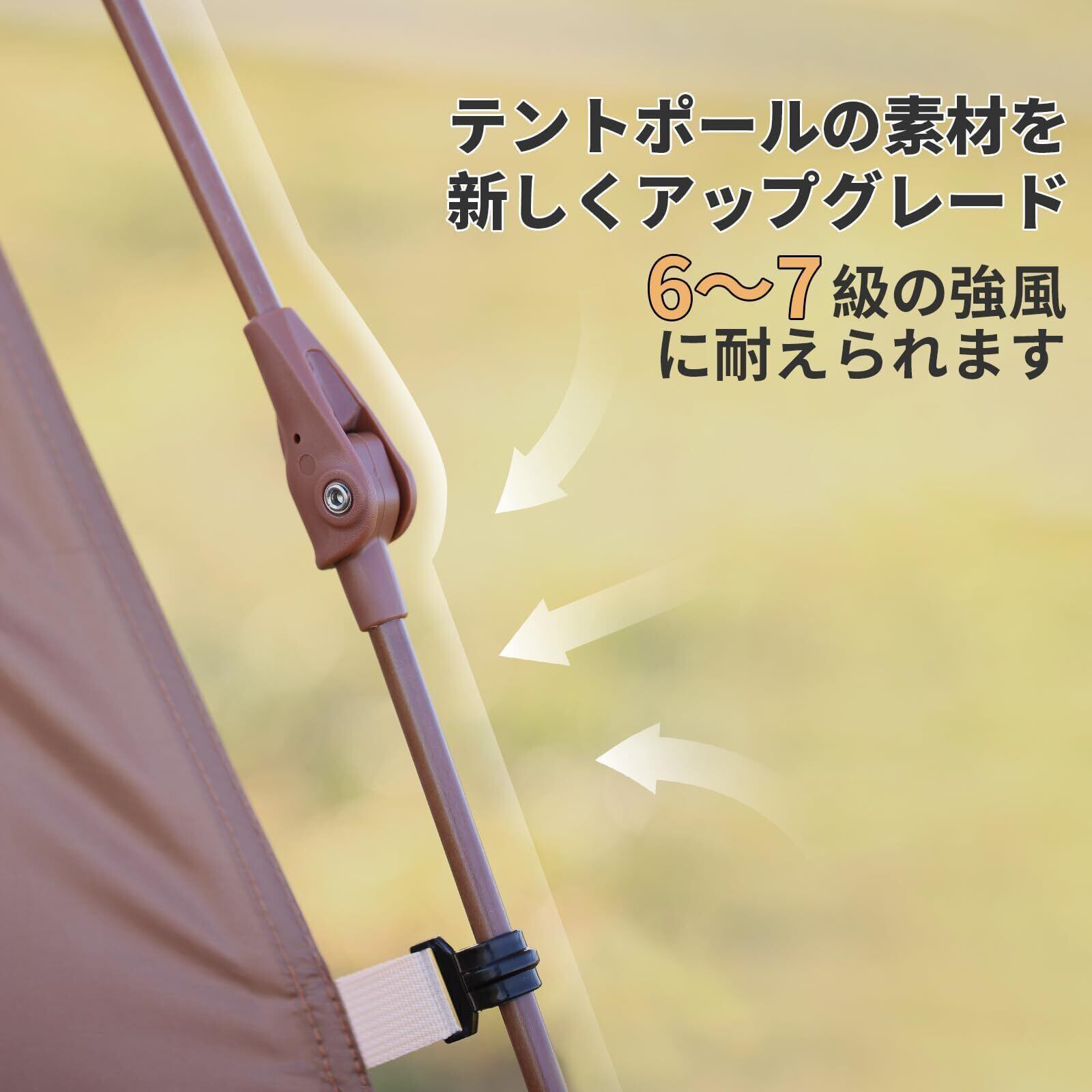 【高靭性ポール】テントポールは高靭性エラスチックファイバー素材を採用し、靭性が強く折れにくく、6~7 級の強風に从容に耐えることができます。アウトドアで突発的な突風が起きても、テントは安定した形状を保ち、容易に変形したり倒れたりすることがなく、しっかりとした安全感を提供します。