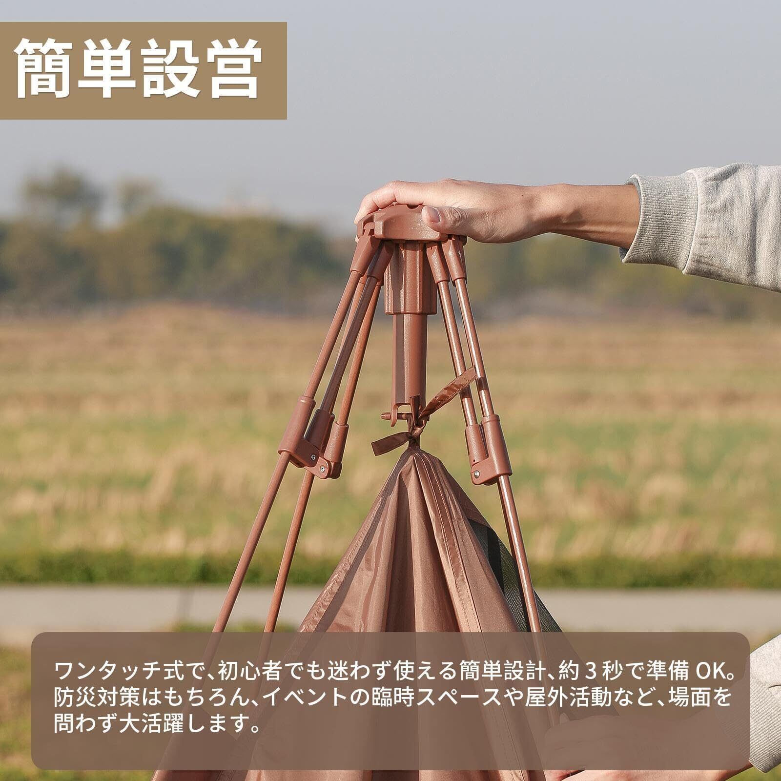 【3 秒設営】複雑な組み立ては不要で、テントは 3 秒速セット構造を採用しています。広げた後、軽く押し上げるだけでセットが完了します;収納時も簡単に折りたむだけでよく、初心者でも説明書を見なくても轻松に操作できます。テントのセットに時間を費やす必要がなくなり、キャンプ場に着いたらすぐにキャンプ体験をスタートできます。