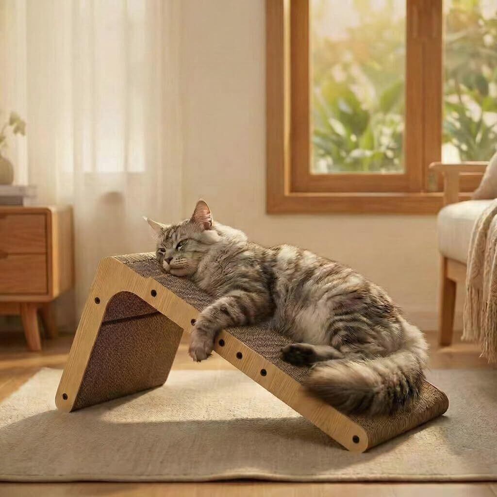 【L型3Way設置で壁・家具を鉄壁ガード】 ユニークなL字型構造は、設置方法を変えるだけで一台三役の活躍を見せます。①**「縦置き」:壁や柱に沿わせて設置すれば、壁紙への引っかき傷を防止するプロテクターに。②「横置き」:床に置けば、安定感抜群の平置き爪とぎ兼ベッドに。③「コーナー置き」**:部屋の角(デッドスペース)を有効活用。高密度段ボールの適度な硬さが、ソファや家具よりも魅力的な「研ぎ心地」を提供し、大切な家財へのイタズラを自然に防ぎます。