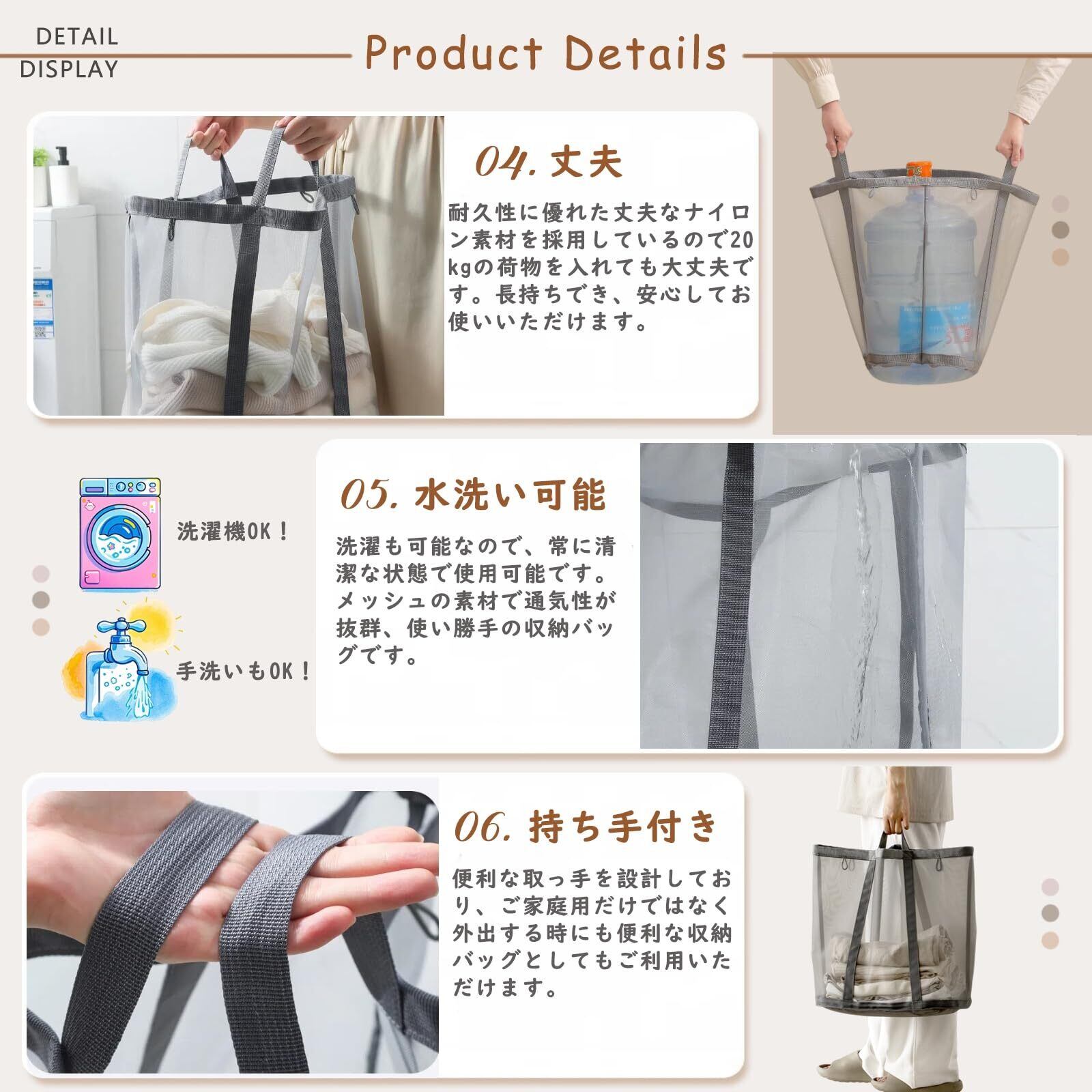 【幅広く活躍する収納バッグ】このメッシュ洗濯かごは、衣類、寝具、ベビーアイテム、スポーツ用品、おもちゃなどを収納できます。家庭用の収納バッグとしては最適です。浴室、寝室、ジム、旅行、温泉、自動車、海辺など様々なシーンに活躍します。また、エコバッグ、プールバッグとしてもご使用いただけます。
