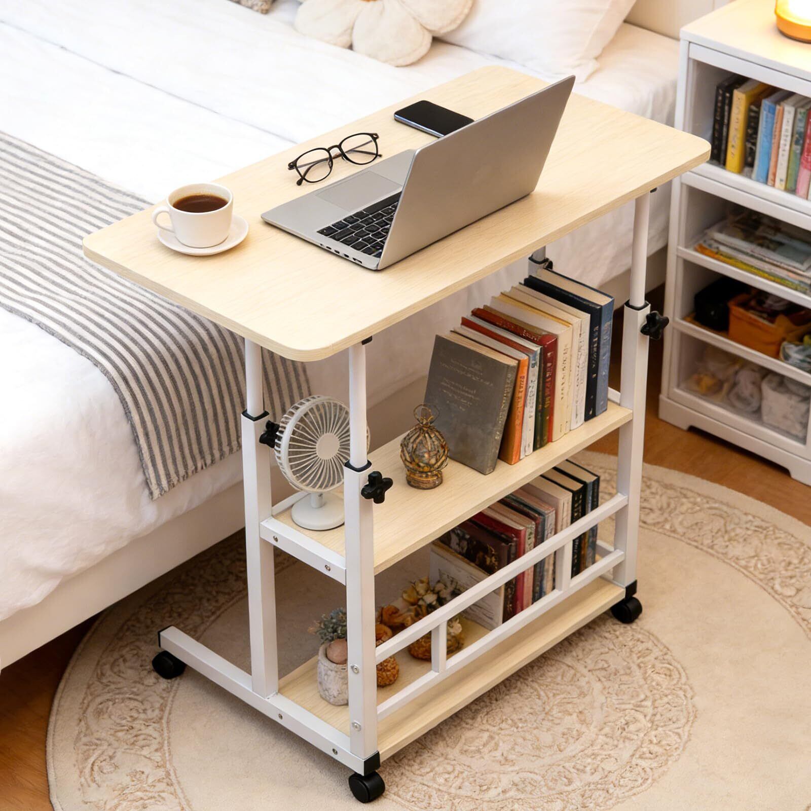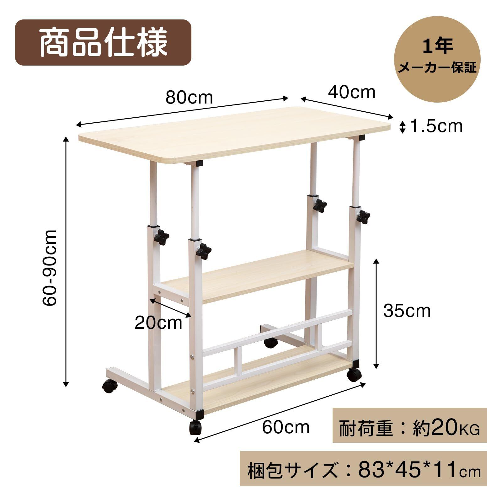 サイドテーブル 介護テーブル 昇降式 無段階高さ調整(60cm~90cm) 3段収納 天板80*40cm ベット横テーブル 多機能 省スペースデ 仕事 勉強 パソコンデスク 組み立て簡単 おしゃれ 日本語説明書付き (ナチュル色)
