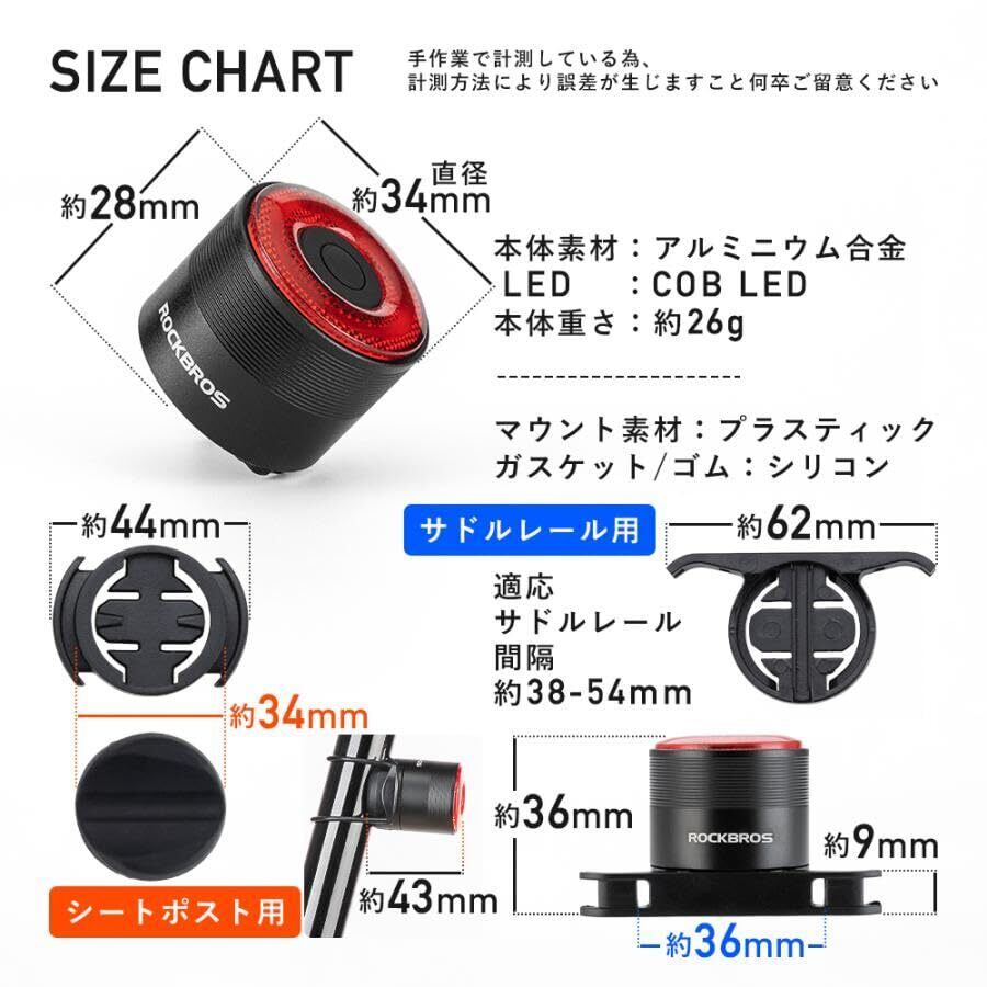 【製品仕様&メーカー】セーフティライトのサイズ:64mm*30mm*34mm、重量も僅か33g(マウント含む)。自転車テールランプはロードバイクやクロスバイクなどの車種に取り付け可能で、取り付け位置も二つがあります(サドルレール・シートポスト)。弊店は六か月間の期間を設置しており、万が一商品に何か問題がございましたら、遠慮せずご連絡ください。