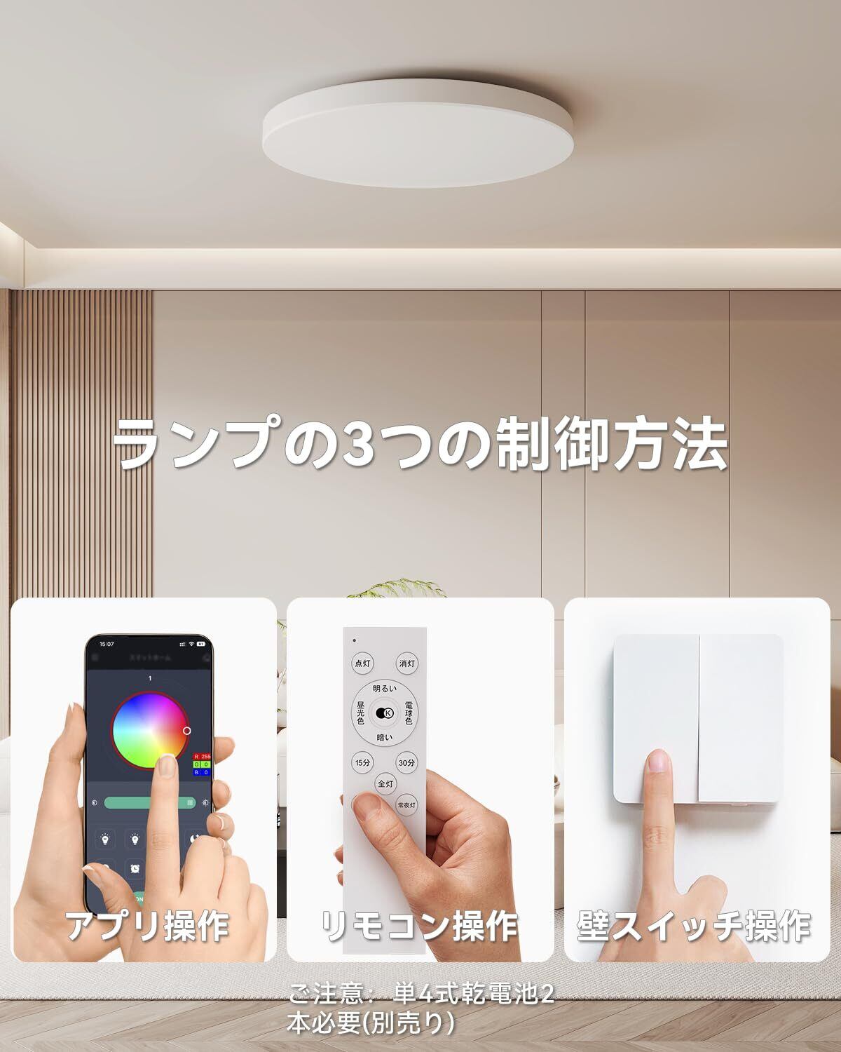 リモコン・スマホ操作:ペアリング手順:壁スイッチOFF→ON後2秒以内に「点灯」ボタンを3~5秒長押し(点滅で完了)※ブレーカー操作でも設定可能。2.4GHzリモコン:最大20m対応・ホルダー付属(電池別売)。アプリ連携:専用アプリ「LampSmart Pro」でスマホからも操作可能。