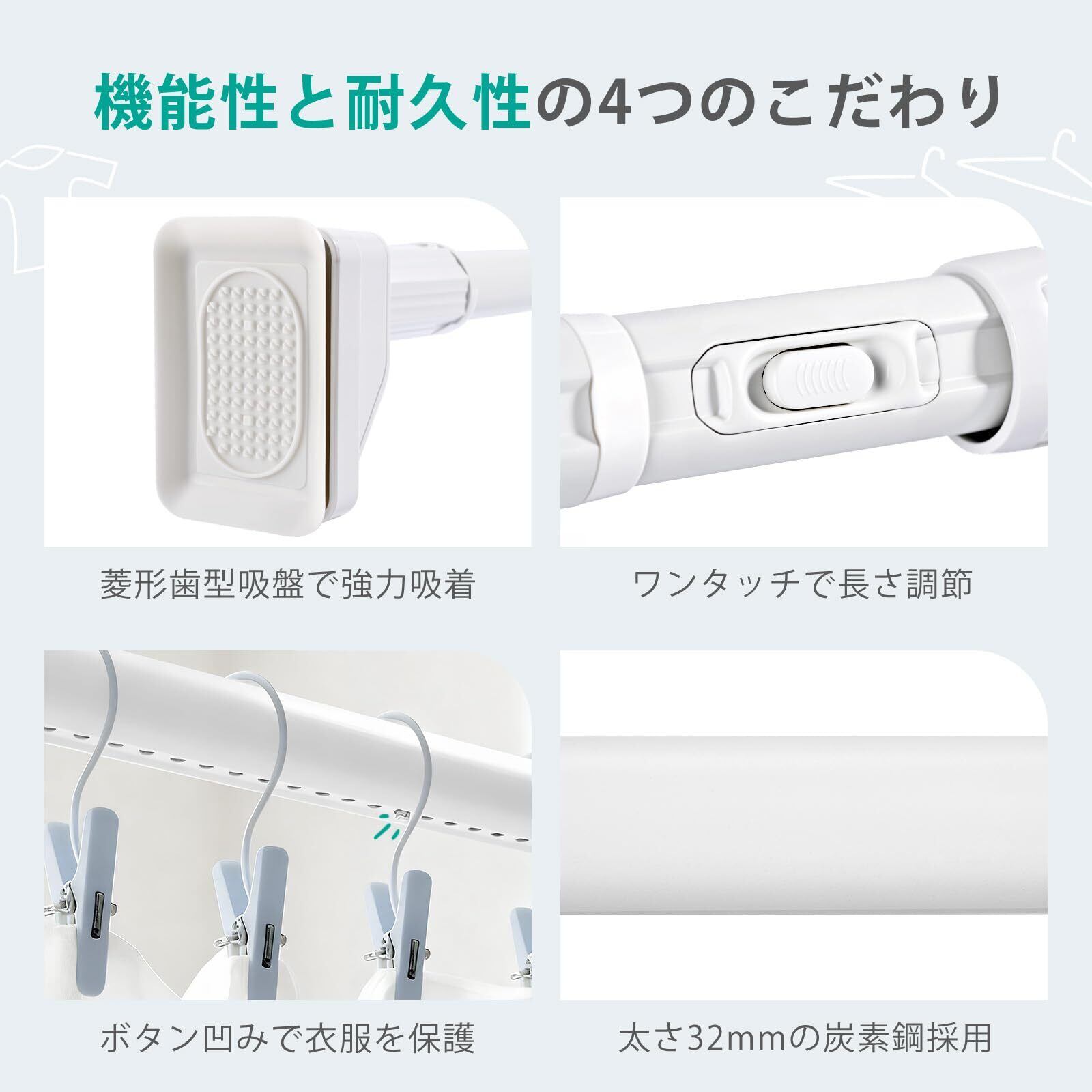 【強力吸着 & 傷つきにくい設計】両端の菱形歯型吸盤が壁面に強力に吸着し、ズレをしっかりロック。さらに、接続部の凹型ボタンデザインにより、衣服への引っ掛かりを防ぎ、大切な衣類を傷めません。32mmの太さある高品質炭素鋼パイプ採用で、長期間の使用でも変形しにくい耐久性を備えています。