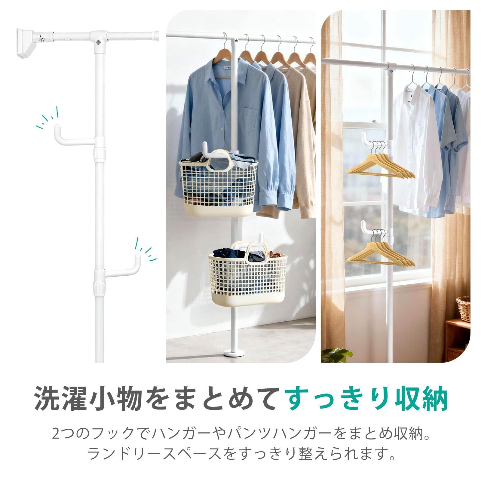 【収納力抜群のマルチフック付き】支柱には便利なマルチフックを装備。ハンガーやランドリーバッグ、洗濯ピンチなどをまとめて収納できるため、物干しラックとしてだけでなく、洗濯周りの収納アイテムとしてもお役立ち。室内物干しの際に、必要な物がすぐ手元に整頓され、すっきりと快適な空間を保ちます。