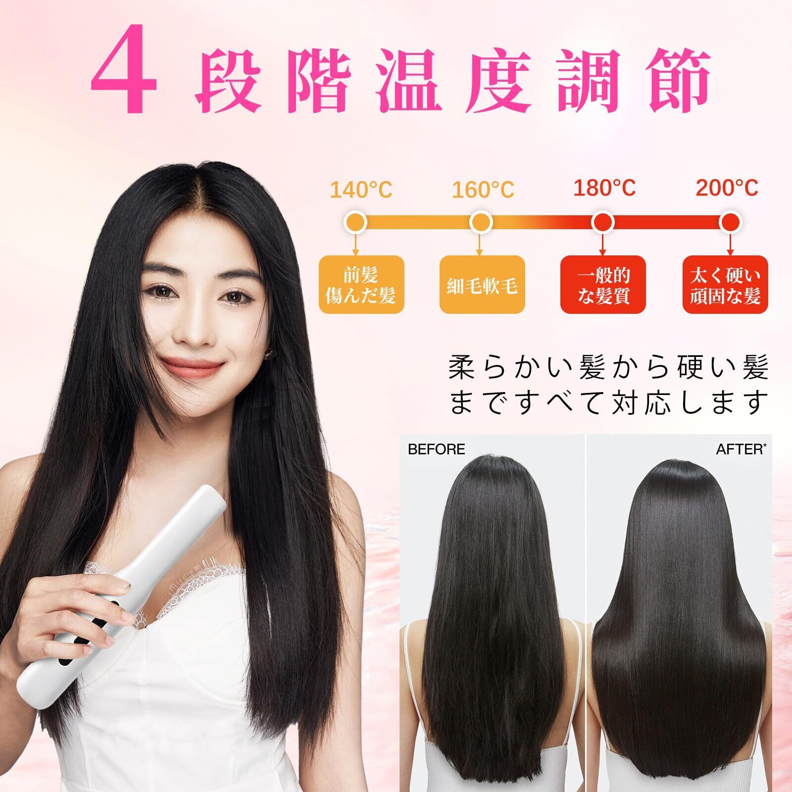 【4段階温度調節&20秒急速加熱】 140℃/160℃/180℃/200℃の4段階の温度調節が可能。髪質、スタイリングに合わせた温度調節が可能で、髪へのダメージを最小限に抑え、艶やかな髪を保つ!20秒だけで急速な予熱可能です、約60秒で温度に達するハイパワーヒーターが付いているので、朝でも忙しいときでも、美しい髪を手早くスタイリングできる。