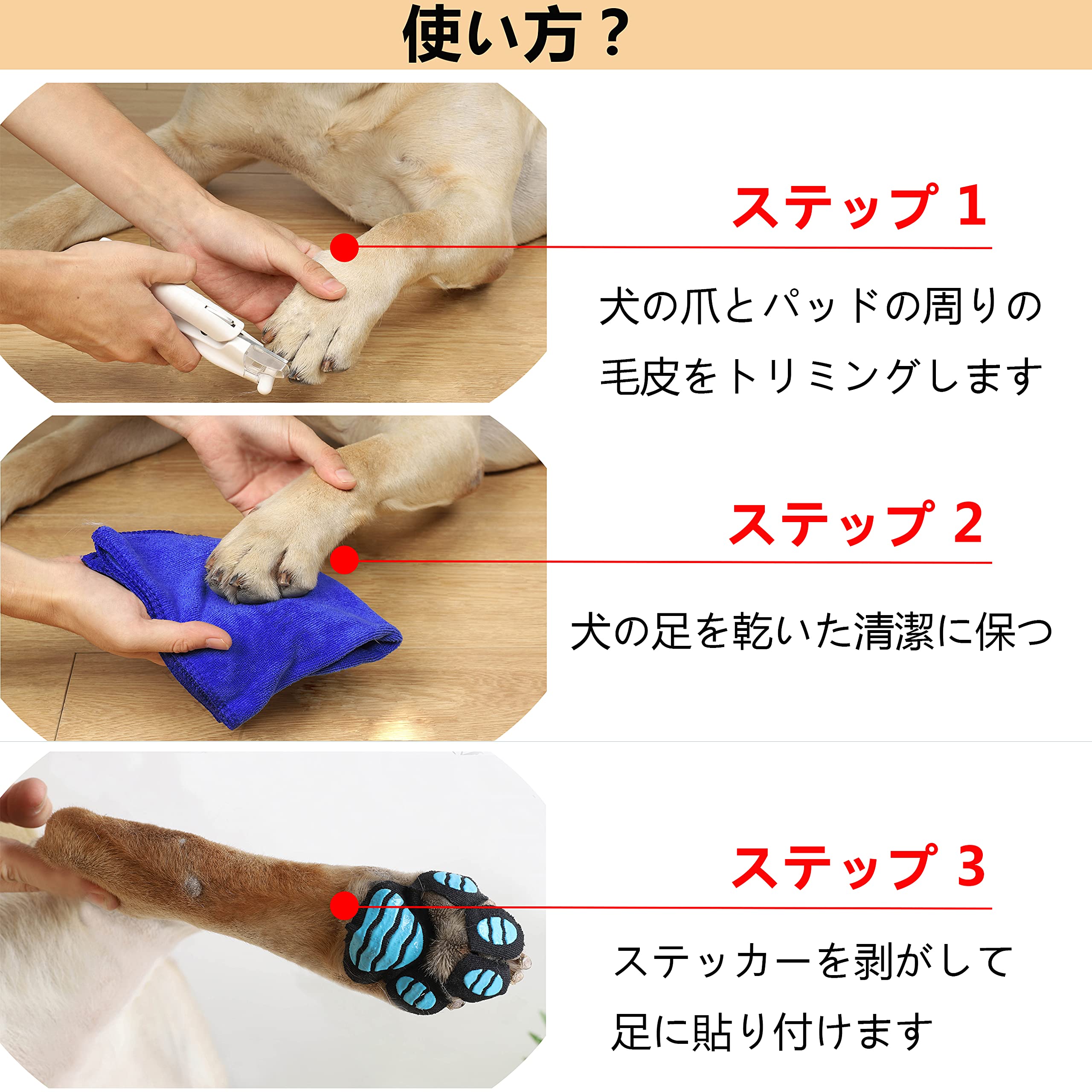 使用が簡単 - 使い捨て&自己接着式のグリップパッドです。パッドを取り換える合間に、愛犬の爪や毛をお手入れしてください。犬の足を清潔に保ち、乾かすことで、トラクションパッドがより長持ちします。