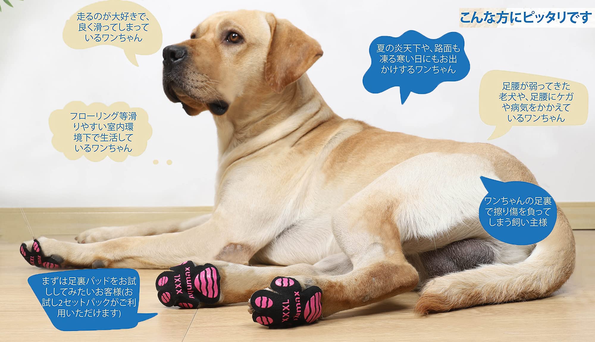 独自の特徴 - 地面との摩擦を最大化できるのは、厚みのあるノンスリップ・タイプのシリコンジェルだけです。愛犬がフローリングの床で滑るのを防ぎます。また、タイル張りやラミネート張りの床では、可動性や安定性を高めます。