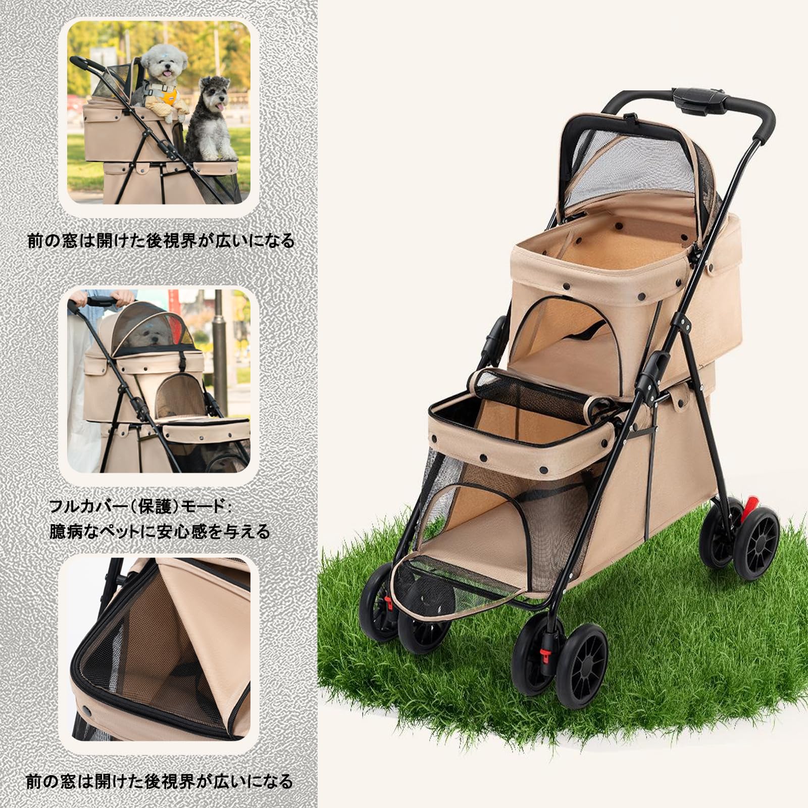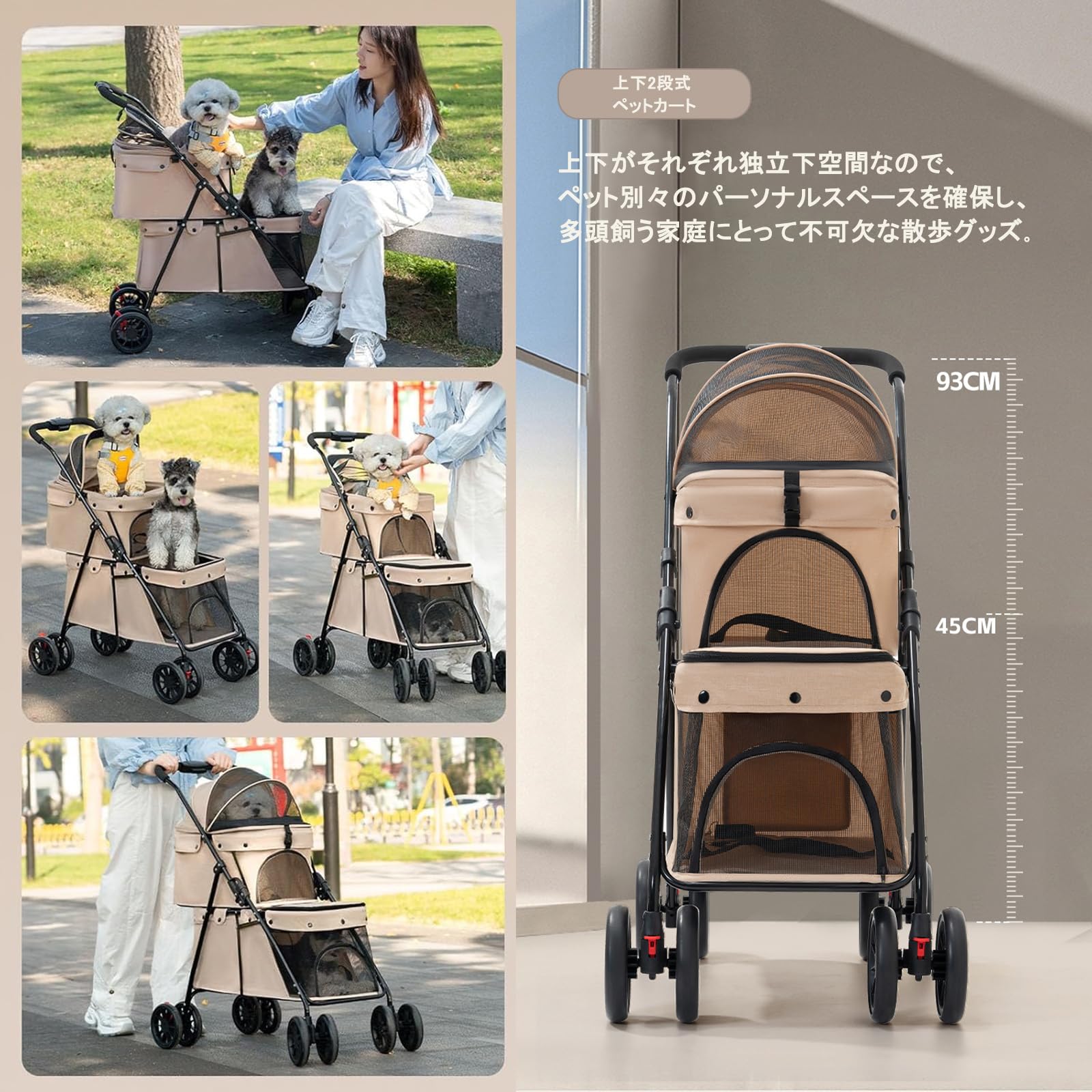 [SAQIANRE] ペットカート 折り畳み式 多頭 上下2段式 ペットバギー ワンタッチ 犬用ベビーカー コンパクト 収納便利 4輪 前輪360°回転 後輪ブレーキ付き 猫 小型犬多頭 中型犬 犬猫兼用 ドッグカートお出かけ 散歩 通院 介護用 (ブラウン)