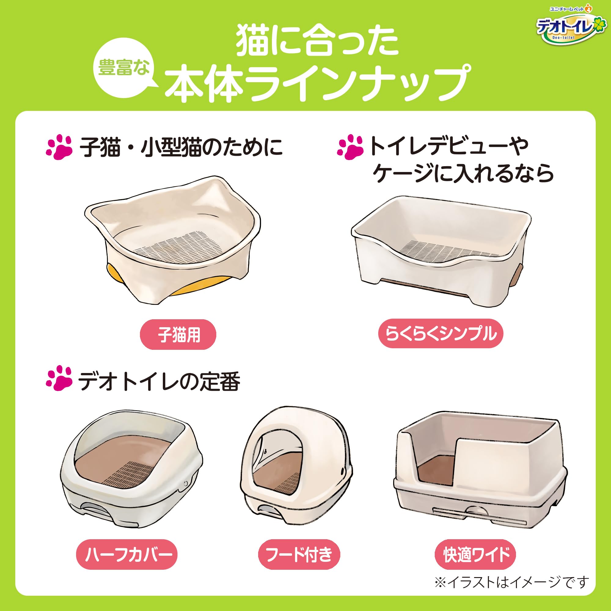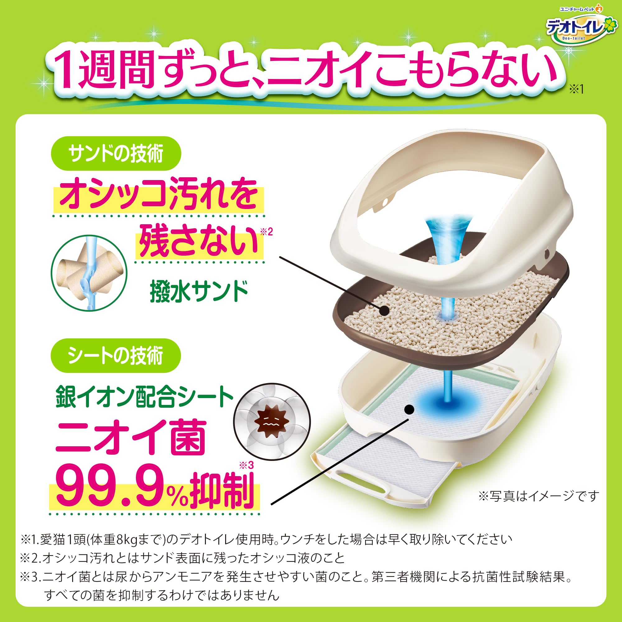 ・ニオわない&キレイ続く※1\n・99.9%抗菌※2\n・シートとサンドでW消臭\n・撥水で足元サラサラ清潔\n・シートは週1回※1、サンドは月1回交換※1でお手入れカンタン\n※1愛猫1頭(体重8kgまで)のデオトイレ使用時。ウンチをした場合は早く取り除いてください。\n※2第三者機関による消臭・抗菌サンド、消臭・抗菌シートの抗菌性試験結果。すべての菌を抑制するわけではありません。 使用方法 ・詳しい使用方法は同梱の案内紙をご覧ください。 【セット方法】 1、トイレ上部をトイレ下部にセットする。 2、引き出しトレーに「専用取替シート」を1枚敷く 3、スノコ部に1袋分(2L)の「専用取替サンド」を敷きつめる