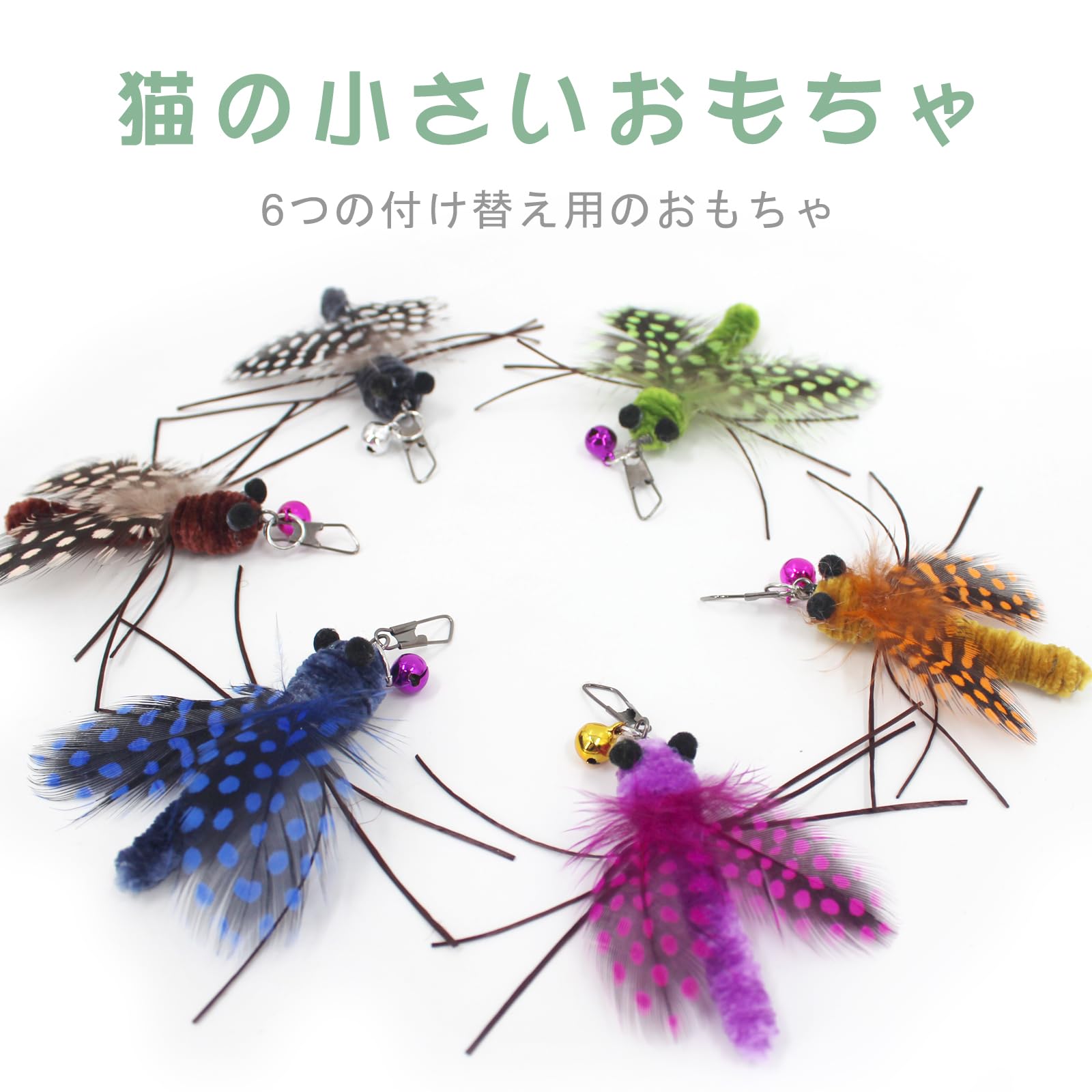 猫おもちゃ交換用:6点大きめ飛ぶ昆虫、リアルで虫っぽい、猫ちゃんの好みによって、じゃらしを取り替えることができます。愛猫はきっと夢中になるはずです。猫ちゃんが楽しく遊ぶおもちゃです。