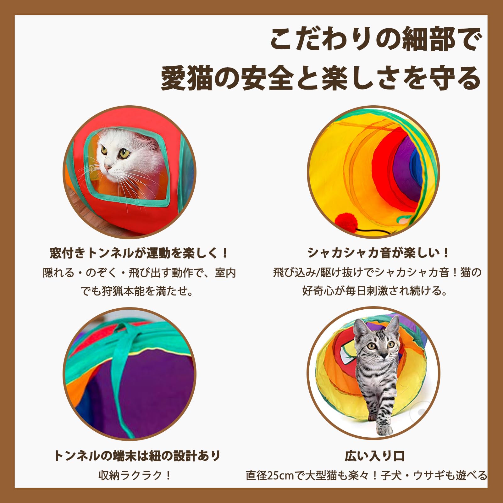 異なる材質で音を発するトンネル - このキャットトンネルは異なる材質で作られており、猫ちゃんが触れると音が出る仕組みです。この音が猫ちゃんの注意を引き、一層楽しませます。サウンドトンネル、音が出る猫おもちゃ、注意を引く猫トンネルを探している方に
