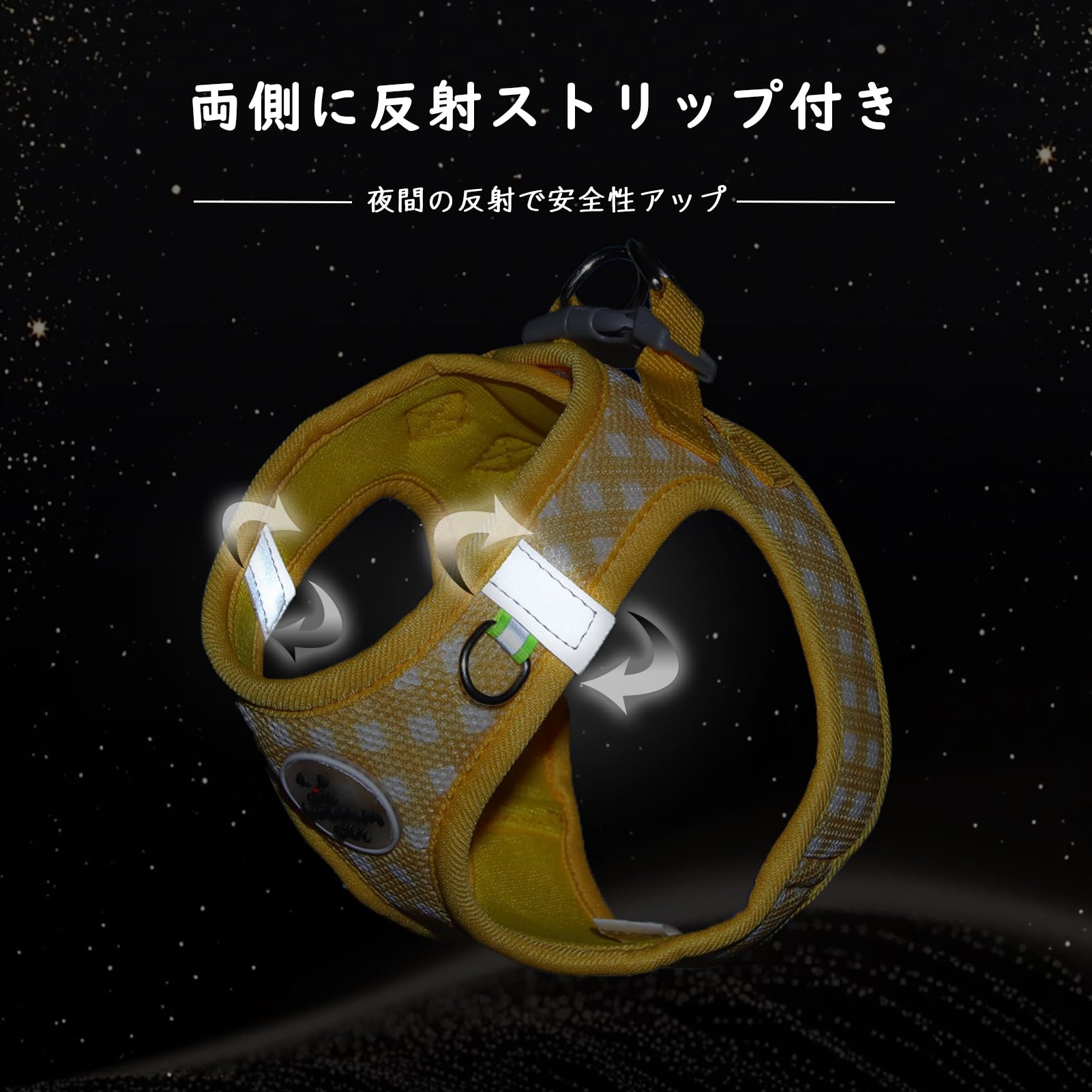 猫用ハーネス リード付き 胴輪 安全設計 脱げない 小型犬兼用 通気性 おしゃれ 可愛い チェック柄 散歩 お出かけ 軽量 通院 災害 避難(チェック) イエロー L
