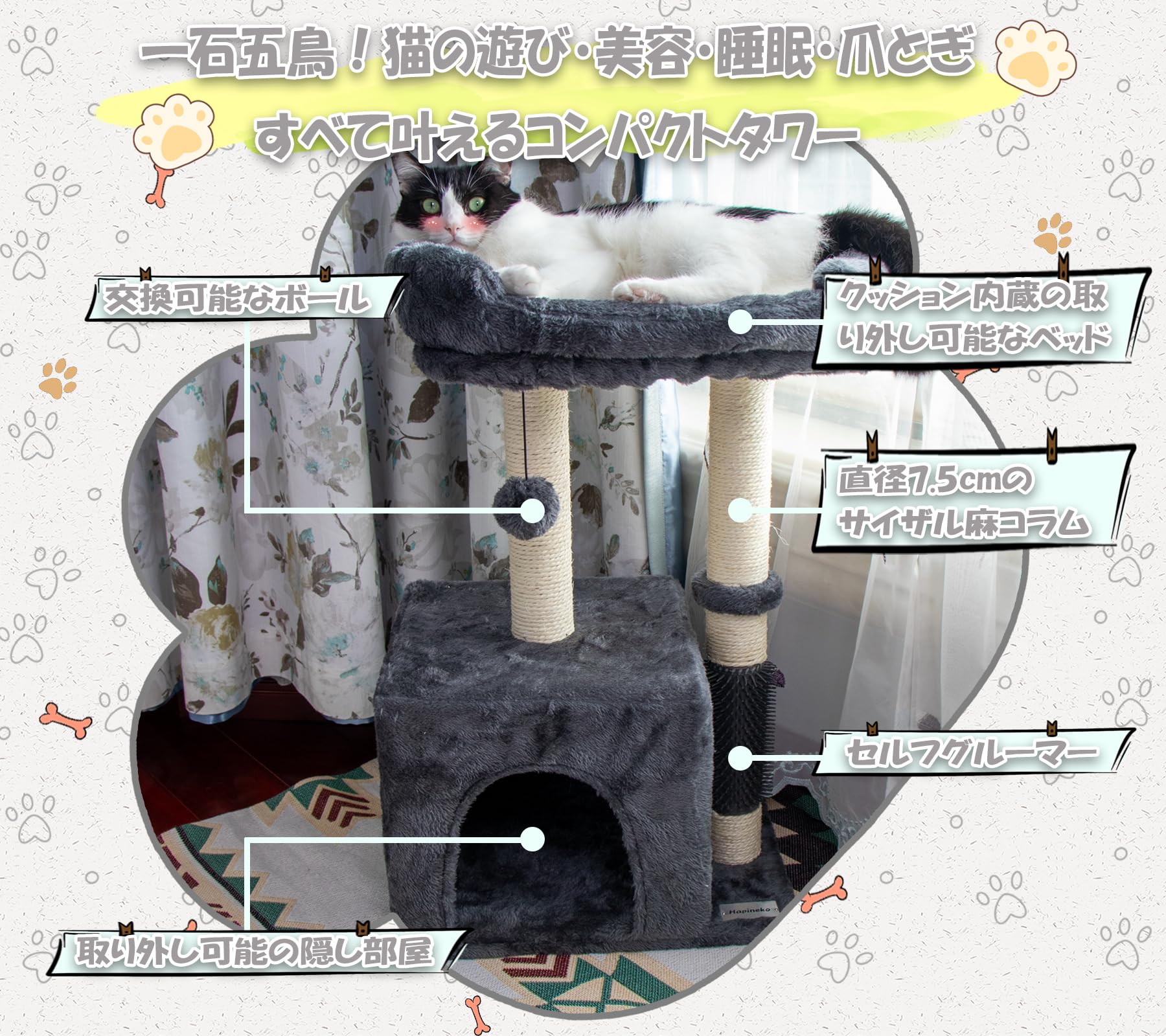 【多機能キャットタワー】猫の日常を快適に過ごさせるため、見おろし展望台、サイザル麻コラム、セルフグルーマー、ダングリングボール、居心地の良いベッドが一つに。コンパクトで場所をとらず、猫用の寝床、爪とぎ、ミニキャットツリー、子猫にも最適。