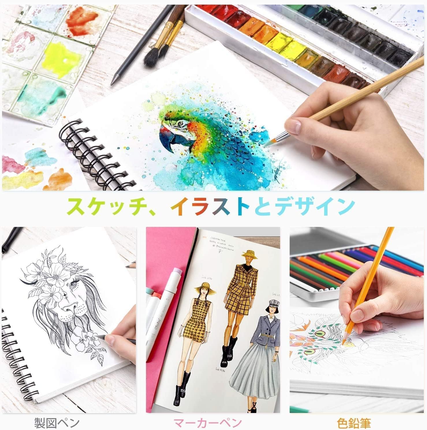 ️【ミックスメディアスケッチブック】:汚れや毛羽立ちを防ぐ機能を備えているすけっちぶっく。優れた靭性と耐久性が特徴で、紙の反りやしわを気にせず使用できます。色鉛筆、水彩、アクリル絵の具、パステル、インク、マーカーペン、ボールペンなどの様々な画材に対応。プロ・アマ問わず、創造力豊かに自由な使い方が可能です。