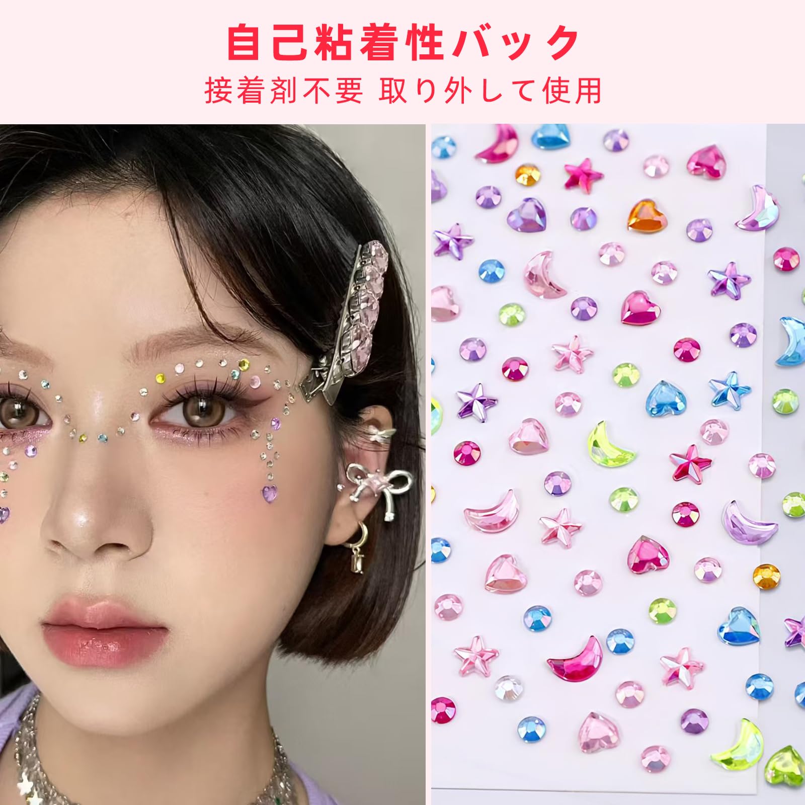 DIY用品: キラキラメイクアップステッカー、アクリル素材で作られ、耐久性があり実用的です。デザインによってはDIY工芸品やジュエリーなどにもご使用いただけます。衣服、携帯電話、ネイルアートアクセサリー、バッグ、グリーティングカードの作成などにも非常に適しており、あなたの生活に彩りと創造性を加えます