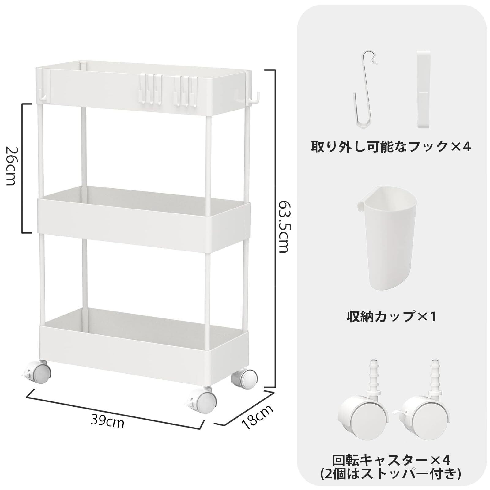 キッチンワゴン キャスター付き ワゴン 隙間収納 スリム 収納カート キッチン 洗面所 収納 13.5cm 18cm 22cm 冷蔵庫横 台所 浴室 トイレ 細い棚 3段 4段 おしゃれ 組立簡単 フック&収納カップ付き (3段式--ホワイト)