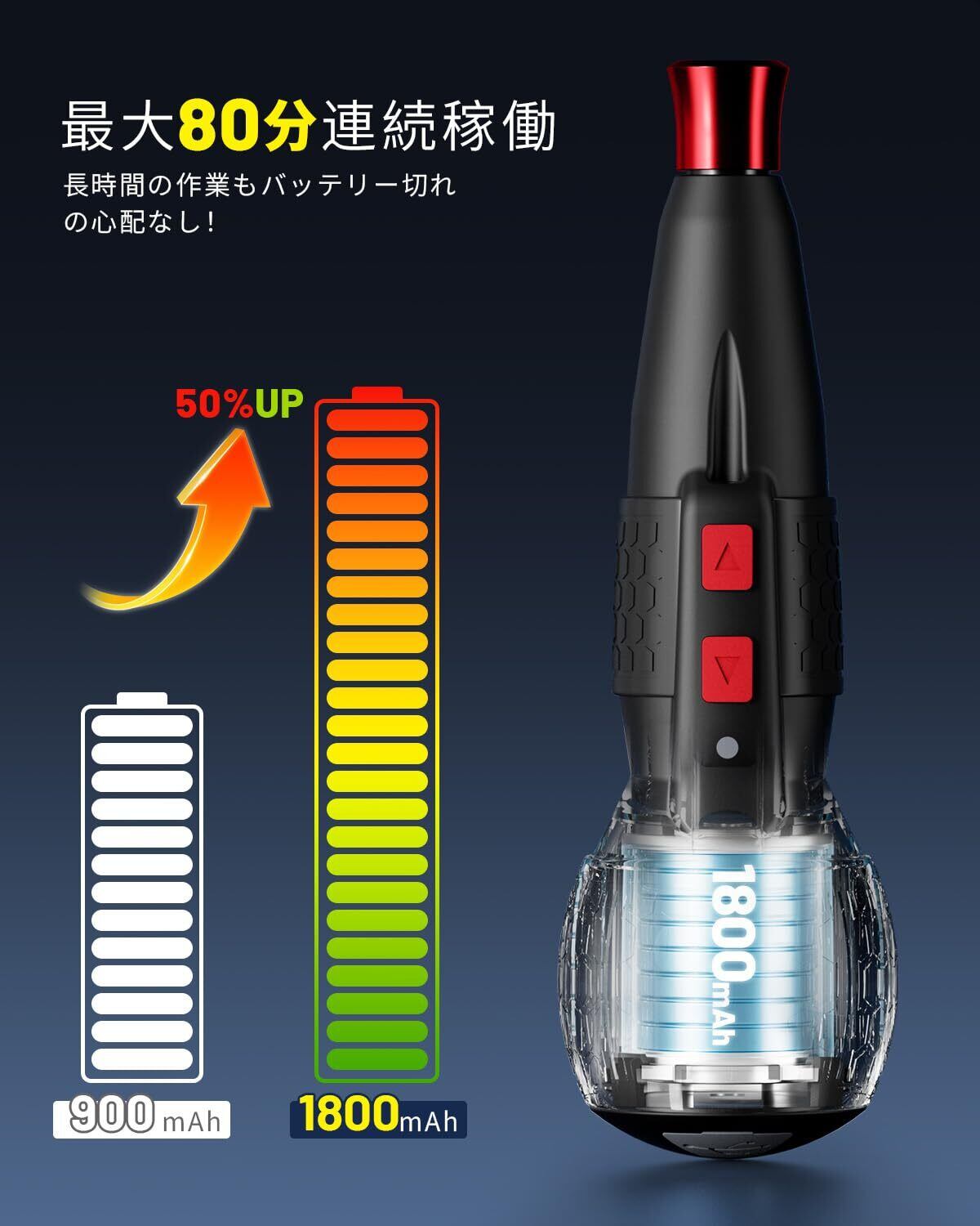 【80分連続使用・1300本以上のネジ締め】Yacooda電動ドライバーは、従来の900mAh容量バッテリーに対して2倍以上の容量!1800mAhの超大容量バッテリーを内蔵しており、約100分でフル充電が完了。その後、約80分間の連続使用(無負荷状態)が可能です。実際に1300本以上のネジを確実に締められることが確認されています(誤差なし)。組み立て途中での電池切れの心配もなく、長時間の作業も安心して続けられます!