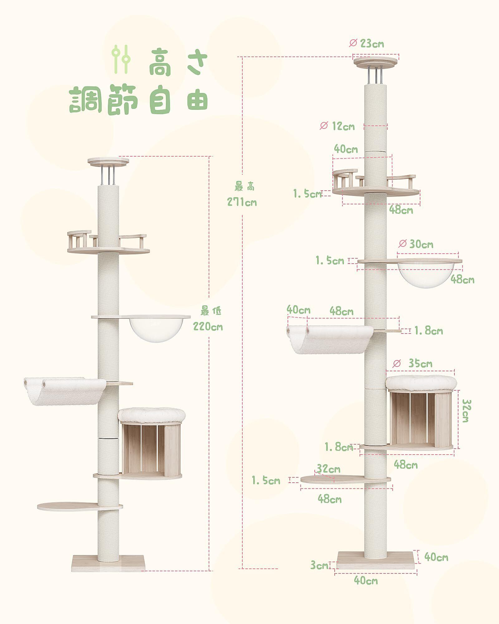 天然木製の突っ張り式キャットタワー。高さ調整可能で、3本の強化スクリュー固定により安定感抜群。直径12cmの極太爪とぎポールで大型猫や多頭飼いでも安心。宇宙船ハンモック、隠れ家ハウス、展望台、柔らかいハンモック、ジャンプ台を搭載し、遊ぶ・休む・眺めるを一台で実現。省スペース設計で室内飼い猫の運動不足やストレス解消にも最適。日本語説明書・組立動画・工具付きで簡単に組立可能