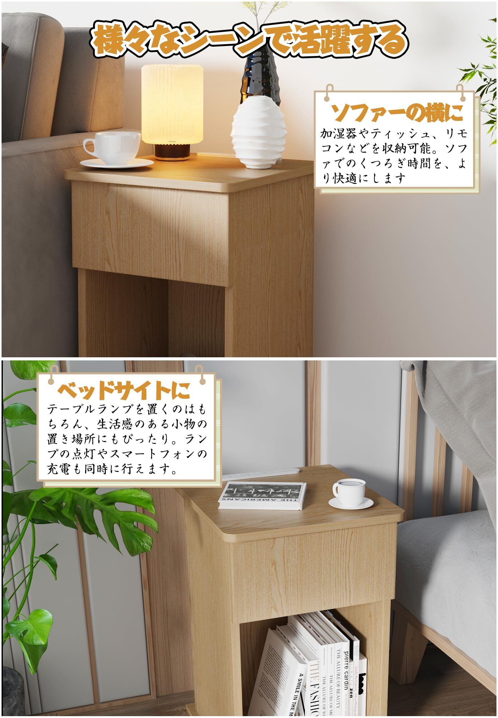 【2口コンセント+USBポート搭載】一般的な2口コンセント付きナイトテーブルに比べ、USBポートを1口多く搭載。複数の機器を同時に使用できます。加湿器・タブレット・スタンドライト・スマートフォンなど、さまざまな機器に対応。コンセントには防塵シャッターを備え、安全性にも配慮しており、充電はもちろん日常使いにも最適です。