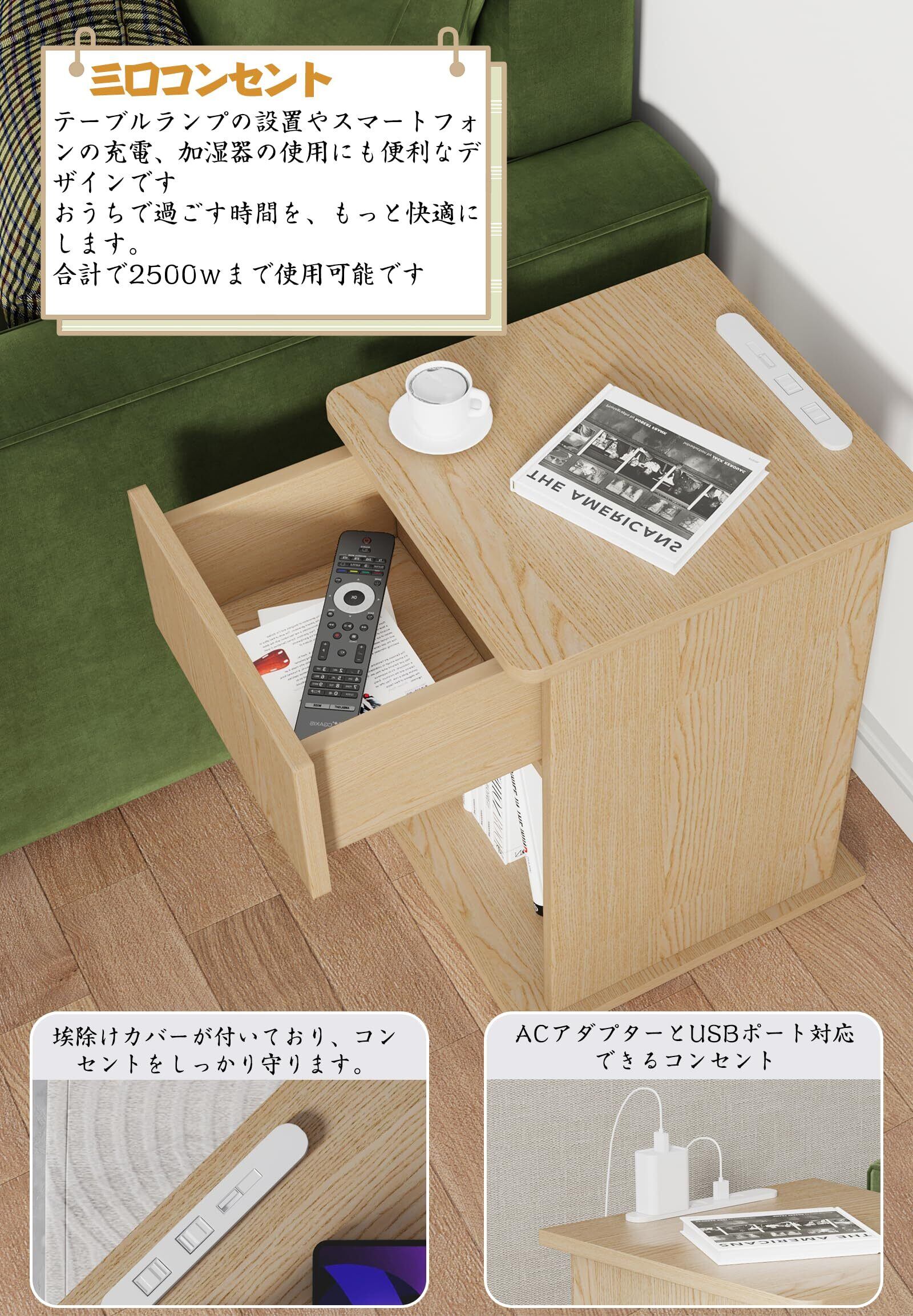 HANYEEナイトテーブル サイドテーブル 引き出し ゴート穴 三口コンセント 幅30cm ベッドサイド ソファーの横 オープンラック A4収納 幅34cm×奥行30cm×高さ50cm ナチュラル