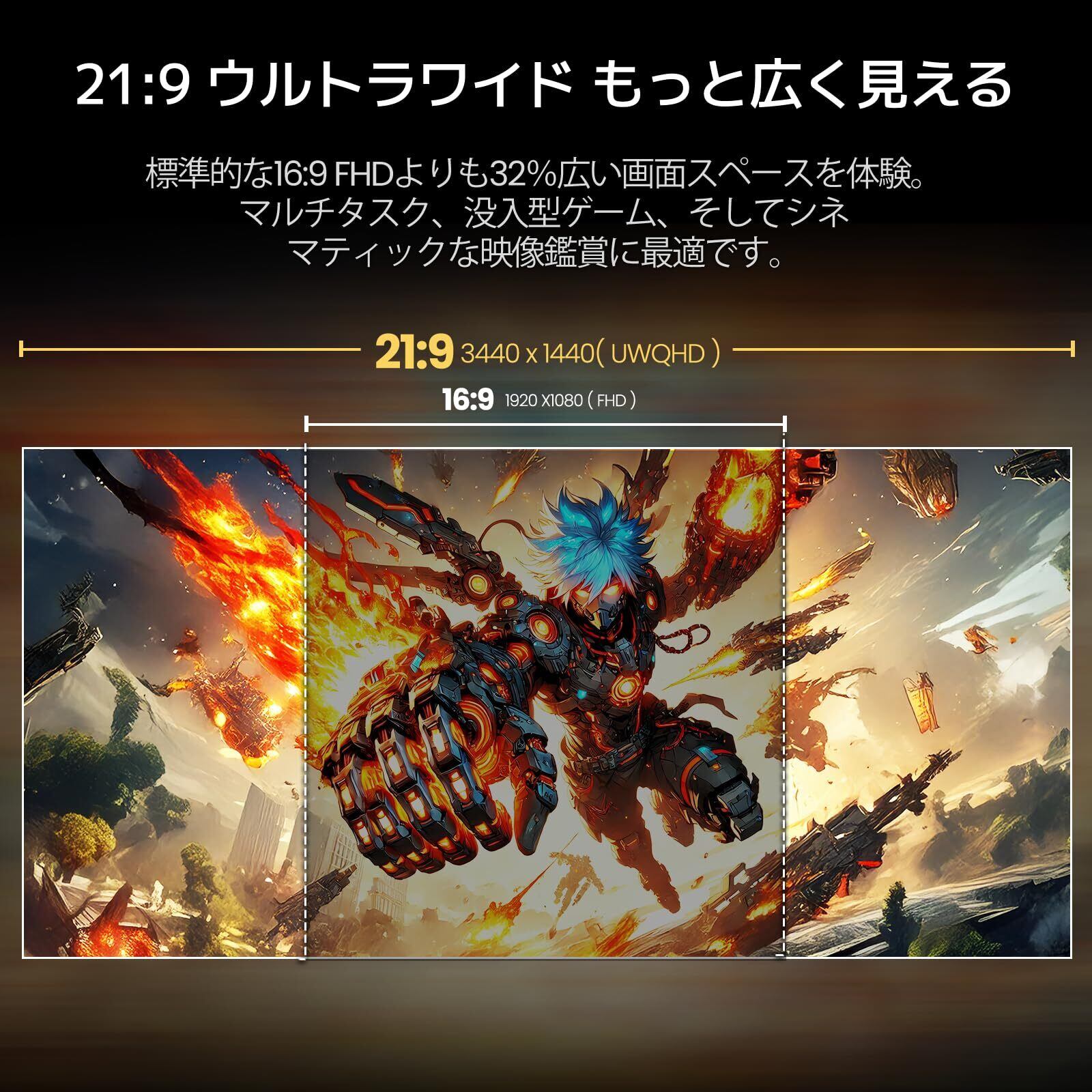 【 34型ワイドIPSで広がる没入感】21:9の超ワイドIPS画面が広大な視野を提供。178°の広視野角と3440×1440の高解像度が、ゲームやマルチタスク作業に圧倒的な臨場感をもたらします。