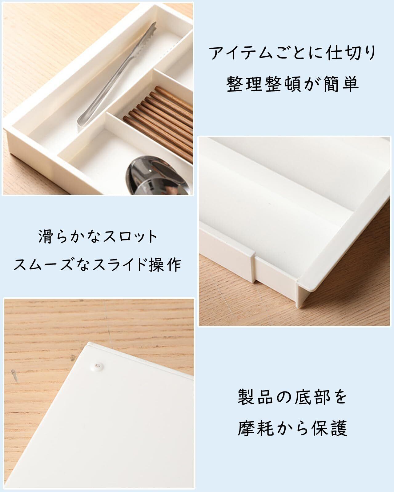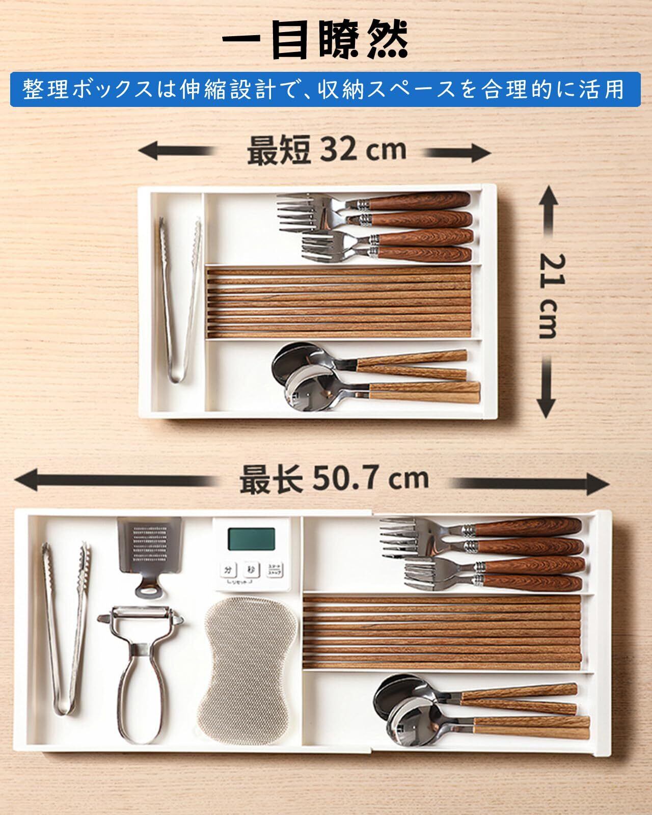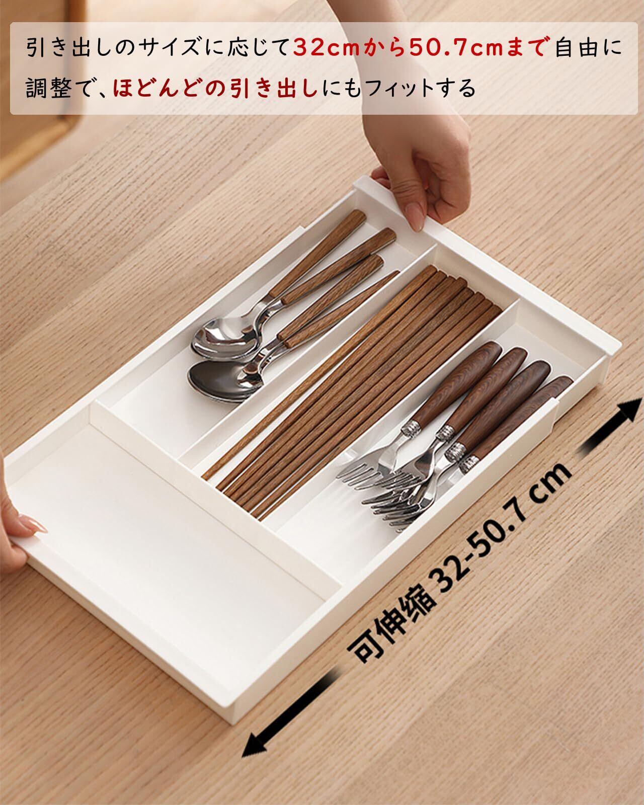 【調節可能な伸縮設計】この収納ケースは、引き出しのサイズに応じて32cmから50.7cmまで自由に調整できます。リビング、書斎、キッチン、ダイニングルームなど、どの場所の引き出しにもフィットし、スペースの効率的な利用を実現します。